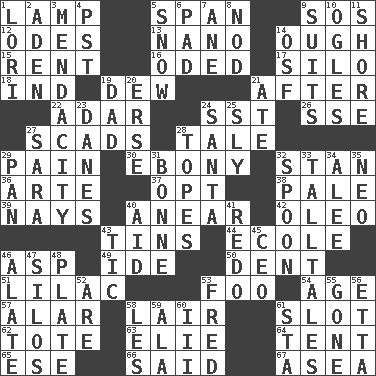 ACROSS 1. Desk light 5. Connect, as a bridge 9. Distress signal 12. Lyric poems 13. Billionth: prefix 14. Ending for "Through" and "Enough" 15. Monthly bill 16. Wrote a lyric poem 17. Grain storage tower 18. Working for oneself (abbr.) 19. Morning condensation 21. Following 22. The sixth month of the Jewish calendar 24. Fast jet (abbr.) 26. Compass dir. 27. Heaps 28. Falsehood 29. Ache 30. Black 32. Comedian Laurel of Laurel & Hardy 36. Johnson of "Laugh-In" 37. Elect 38. Diluted with white 39. Negative votes 40. Approach 42. Margarine 43. Canisters 44. Learning spot: Fr. 46. Cleo's killer 49. Binary compound 50. Undesirable depression on a surface 51. Pale purple color 53. Egg _ yung 54. Personal question 57. Having or resembling wings 58. Den 61. Narrow, elongated depression 62. Haul 63. Writer Wiesel 64. Portable shelter 65. Compass dir. 66. Stated 67. Toward the sea DOWN 1. Australian parrot (variant) 2. Arabian gulf 3. Ananias' fault 4. Pacific Standard Time (abbr.) 5. Frozen precipitation 6. Writing tablet 7. One (Scot) 8. Lower and raise head in agreement 9. Sets or collections 10. Stares at amorously 11. Dinah or Pauly 14. Order of Saint Francis (abbr.) 19. June honoree 20. Celtic language 21. Had dinner 23. Natives or inhabitants of Denmark 24. Before Barbara or Clara 25. Mischievous 27. "Two Mules for Sister ____" 28. Drinks excessively 29. Baking dish 31. Child's nurse 32. Soup utensil 33. Baron Munchausen's specialties 34. Toward shelter 35. Modern: prefix 40. Assist 41. Do over again 43. Nervous spasm 45. Corporate head (abbr.) 46. Having winglike extensions 47. Grain storage towers 48. Food holder 52. "We ___ not amused" (Victoria) 53. Flintstone 55. Went 56. Singer James 58. French article 59. In the manner of 60. One more than two 61. R.R. building