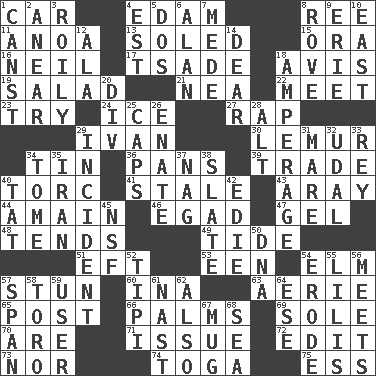ACROSS 1. 4-wheeled motor vehicle 4. Dutch treat 8. Portuguese money of account (variant) 11. Small Philippine buffalo 13. Having a sole or soles 15. Mouth or opening 16. Famous astronaut Armstrong 17. Sadhe (variant) 18. Advice 19. Vegetable dish 21. Teachers' org. 22. Rendezvous 23. Attempt 24. Frozen water 27. Strike 29. "Terrible" tsar 30. Arboreal primate 34. Metal container 36. Zero-star reviews 39. Swap 40. Torque (variant) 41. Lacking originality or spontaneity 43. Like ___ of sunshine 44. At full speed 46. Mild oath 47. Set 48. Is inclined (to) 49. Event that recurs at intervals 51. Lizard (obsolete) 53. Car or cant ending 54. Shade tree 57. Surprise greatly 60. _ tizzy (2 wds.) 63. Nest on high 65. Mail 66. Insides of hands 69. Not divided or shared with others 70. "We ___ not amused" (Victoria) 71. Come out of 72. Prepare for publication 73. Not either 74. Ancient Roman robe 75. Curvy letter DOWN 1. 2nd pers. sing. pres. of can (arch.) 2. Approach 3. Turbulent 4. Eastern Standard Time (abbr.) 5. Two (Sp.) 6. Actor Alda or Thicke 7. Ancient Persian 8. Be footloose 9. 4th largest of the Great Lakes 10. Compass direction 12. In the manner of 14. Letter starter 18. Electrical Measurement 20. HTML Container Element 25. Smile enhancers 26. Maternal 28. Keyboard modifier key 29. Event 31. Female horse 32. Allodial 33. Marina Del _, California 34. Heavy book 35. SW Asia republic 37. Tired old horse 38. Chalkboard 40. Make lace 42. Singer Brickell 45. Overdraft (abbr.) 50. Heredity factor (abbr.) 52. Native american tent (variation) 54. Eat (away) 55. Ms. Damita and namesakes 56. Confronts 57. Connect, as a bridge 58. "Corrida" creature 59. One who uses or employs something 61. Political cartoonist Thomas 62. In addition 64. Compass dir. 67. Java container 68. Ocean