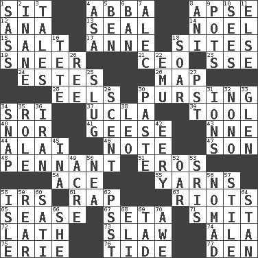 ACROSS 1. Be seated 4. Swedish rock group 8. Domed church section 12. Santa ___, CA 13. Lick closed 14. Christmas carol 15. Table seasoning 17. Queen of England 1702-14 18. Settings 19. Contemptuous expression 21. Corporate head (abbr.) 23. Compass dir. 24. _____ Park, CO 26. Atlas unit 28. Snakelike fish 30. Puckering 34. _ Lanka 37. Southern CA. univ. 39. Instrument 40. Not either 41. Honkers 43. Compass dir. 44. Jai ____ 46. Musical sound 47. Boy, to dad 48. Pre-World Series prize 51. Greek god of love 54. Adept person 55. Tall tales 58. Big collection agency 61. Strike 63. Debaucheries 65. Gospel singer Marvin 67. Bristle 71. Stricken, poetically 72. Thin strip of wood or metal 73. Cole _ (cabbage dish) 74. According to 75. 4th largest of the Great Lakes 76. Periodic rise and fall of the sea level 77. Lair DOWN 1. Backtalk 2. Lacking in sense or substance 3. Stories 4. White ___ sheet 5. Benjamin's nick name 6. Prohibit 7. Actor Baldwin 8. Black tropical American cuckoo 9. Cooking vessels 10. Observes 11. Otherwise 16. False hair 18. Fly high 20. Portuguese money of account (variant) 22. Australian flightless bird 25. Snaillike creature with no shell 27. Pacific Standard Time (abbr.) 29. Odor 30. Thick mixture 31. Charged atoms 32. Words to Nanette 33. Small, secluded valley 34. Fastener 35. Hero or heavy, e.g. 36. SW Asia republic 38. Lion 42. Suggestive of the supernatural 45. _ tizzy (2 wds.) 49. 1/640 square mile 50. Teachers' org. 52. Rowing implement 53. Indian titles of respect 56. Wanderer 57. Vertical member of a panel or frame 58. Capri or Wight 59. Stern 60. Suttee (variant) 62. Inconspicuous attention getter 64. Comedian Laurel of Laurel & Hardy 66. A female animal or person 68. Connecticut Ivy Leaguer 69. Small boy 70. Deep reverence