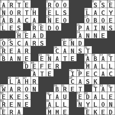 ACROSS 1. Johnson of "Laugh-In" 5. Friend of Pooh 8. Compass dir. 11. _ pole 13. Raised railways 14. Made of lace 15. Phillipine bananalike plant 16. Modern: prefix 17. Mitch Miller's instrument 18. French article 19. Make new 21. Aches 22. Froth on beer 24. Queen of England 1702-14 25. Motion picture awards 27. Conclude 29. Posterior 30. 2nd pers. sing. pres. of can (arch.) 32. Object of repulsion 33. Related on the mother's side 35. Blind as ____ 39. Postpone 41. Shopping center 42. Had dinner 43. Medicinal drug used to evoke vomiting 45. Cowardly lion portrayer 48. Keg 49. Make _____ (do battle with) 50. Cy Young winner Saberhagen 52. Make lace 55. Supplements with great effort 56. The 19th letter of the Greek alphabet 57. Peak District village in England 59. French philosopher Descartes 60. 100% 61. Thermoplastic polyamide 62. Period 63. Madame (abbr.) 64. Made supply last DOWN 1. Of or related to the anus 2. Loose flowing garment 3. File 13 4. And so on (abbr.) 5. Tear apart 6. Margarine 7. Bear (Spanish) 8. Unit of acoustic absorption 9. Biscuitlike quick bread 10. Sight organs 12. Ethiopian city, capital of Harari 14. Grant temporary use of 20. Begley and Asner 21. Writing tablets 23. Having ears or earlike features 25. Globe 26. Ocean 27. Erode 28. Compass dir. 30. 4-wheeled motor vehicle 31. Makes less strong or intense 33. Lizard (obsolete) 34. Born 36. Sass 37. Wing 38. Affectionate concern, for short 40. Merit 43. Frozen water 44. Eucharist need 45. Member of a famous L.A. basketball team 46. Sports stadium 47. Flexible conduit 49. We are 50. Lip ointment 51. General guideline 53. _ vera 54. Be inclined (to) 56. Scottish cap 58. Color