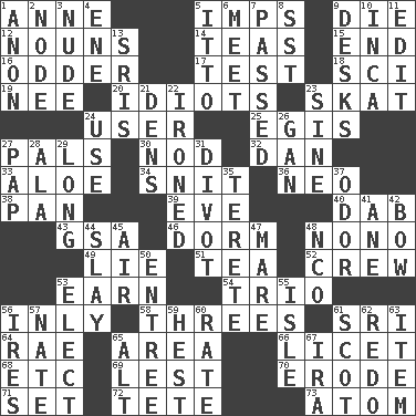 ACROSS 1. Queen of England 1702-14 5. Naughty children 9. Pass on 12. Parts of speech 14. Beverages made from leaves 15. Conclusion 16. More peculiar 17. Trial 18. _-fi 19. Born 20. Foolish or stupid persons 23. Three-handed card game 24. One who makes use of a thing 25. The front part of a cuirass 27. Friends 30. Dreamland 32. Daniel's nick name 33. _ vera 34. In a ____ (agitated or irritated) 36. Modern: prefix 38. Baking dish 39. Night before a holiday 40. Pat or tap gently 43. Girls' org. (abbr.) 46. Dormintory (informal) 48. Words to Nanette 49. Untruth 51. Beverage made from leaves 52. Ship's personnel 53. Merit 54. Musical group of three 56. Inwardly 58. Trios 61. _ Lanka 64. Actress Charlotte 65. Type of rug 66. It is permitted: Lat. 68. And so on (abbr.) 69. For fear that 70. Wear away 71. Put into a specified state 72. False hair 73. Tiny particle DOWN 1. At once, immediately (arch.) 2. Connecting point 3. Naked 4. Compass dir. 5. "Tell ____ the Marines!" 6. Confront 7. Went by 8. Fast jet (abbr.) 9. Writing tables 10. South American Indian 11. Prepare for publication 13. Indian titles of respect 21. Habitations of wild animals 22. Pressed 23. Trig term 24. Purpose 26. Separate the seeds from cotton 27. Infant food 28. According to 29. Having great length 31. A piece of turf (Scot.) 35. Cigar-shaped 37. Scent 41. One (Scot) 42. Arrow shooter 44. Kill 45. Atmosphere 47. Female horse 48. Non-commissioned officer (abbr.) 50. Main course 53. Voters do this 55. Small island 56. Angers 57. Nathan's nickname 59. Command 60. Pace 61. Native of Scotland 62. Redecorate 63. A distinct part 65. The first octave above the treble staff 67. Retirement account (abbr.)
