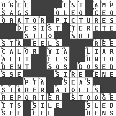 ACROSS 1. Double curve, resembling the letter S 5. Eastern Standard Time (abbr.) 8. Electrical Unit 11. Settles 12. Margarine 13. Corporate head (abbr.) 14. Speaker 17. Photos 19. Cease 21. Cigar-shaped 22. Grain storage tower 23. Indian title of respect (Mr.) 24. R.R. building 27. Snakelike fish 29. To sift 32. Bodily heat indicating an inflammation 34. By way of 36. One who doesn't tell the truth 37. Set down 38. Raised railways 39. To (old English) 40. Undesirable depression on a surface 41. Distress signal 42. Administered medicine 43. Compass dir. 44. Beget 46. Compass dir. 47. Parent Teacher Association (abbr.) 50. Oceans 52. A viewer who gazes fixedly 55. Ringlike coral islands and reefs 57. News announcer 59. Moe Howard, for one 62. ___ a Wonderful Life 63. Drop; flow; fall 64. Downhill vehicle 65. Observe 66. Snakelike fish 67. Coop moms DOWN 1. Bear (Spanish) 2. Slender fish 3. Mild oath 4. _____ Park, CO 5. Connecticut Ivy Leaguer 6. Religious groups 7. Carrier 8. 1/640 square mile 9. Confront 10. Airs 12. Elect 15. Flexible twig of a willow tree 16. Cause heat under the collar 18. RI univ. 20. Finds the solution 24. Oodles 25. Falsehoods 26. Place in a line 28. Grain storage towers 29. Wash lightly 30. Ingested 31. Eat (away) 33. Baseball player Mel 35. Help 36. Nilotic language 42. Started a card game 45. Vintage cars 47. Adept person 48. Laconic 49. Nick name for Arthur 51. Agitate, as a liquid 52. Indian titles of respect 53. Wig 54. Domed church section 55. "We ___ not amused" (Victoria) 56. Flatfish 58. Pipe bend 60. Commissioned mil. rank 61. Begley and Asner