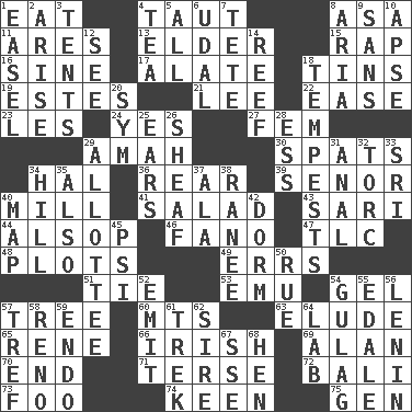 ACROSS 1. Erode 4. Drawn tight 8. White ___ sheet 11. Ancient Greek god of war 13. A person who is older than you are 15. Hit sharply and swiftly 16. Trig term 17. Having winglike extensions 18. Canisters 19. _____ Park, CO 21. Area sheltered from the wind 22. Relaxation 23. French article 24. It is so 27. Opposite of masc. 29. Nanny 30. Arguments over trivial matters 34. Actor Linden 36. Located in or toward the back 39. Sir (Sp.) 40. Place where flour is made 41. First course 43. Indian skirt 44. Columnist Joseph or Stewart 46. Papal veil 47. Affectionate concern, for short 48. Small pieces of grounds 49. Blunders 51. Make a knot 53. Australian flightless bird 54. Set 57. Family _ (genealogy) 60. Mountains (abbr.) 63. Evade 65. French philosopher Descartes 66. From or relating to Ireland 69. Actor Alda or Thicke 70. Conclusion 71. Laconic 72. Indonesian resort city 73. Egg _ yung 74. Peachy ____! 75. Commissioned military rank (abbr.) DOWN 1. Artist's stand 2. Ascend 3. Portable shelters 4. Afternoon social gathering 5. Everything 6. Freehold land 7. Wig 8. Roberta Peters solo 9. Without 10. Domed church section 12. Observe 14. Coral collection 18. Storms 20. Symbol (abbr.) 25. Hearing organs 26. To gather and bind into a bundle 28. Double-curved letter 29. One to whom something is allotted 31. Of or related to the anus 32. Torque (variant) 33. Indian title of respect (Mr.) 34. Land elevation 35. In addition 37. Wing 38. The wife of a rajah (variant) 40. Atlas unit 42. Dormintory (informal) 45. Air pressure measure (abbr.) 50. Regret 52. Give off 54. POW camp 55. Peak District village in England 56. Soviet premier 1918-24 57. Not kosher 58. Western Nevada city 59. Inside; within (prefix) 61. Long journey 62. Father 64. Experiment locale 67. Compass dir. 68. Layer