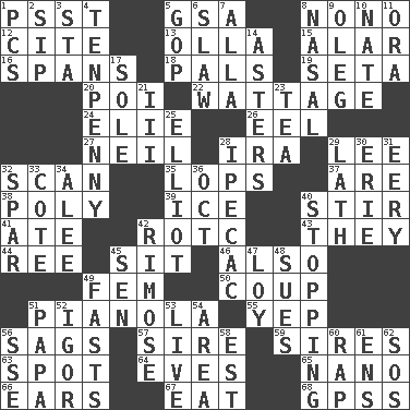 ACROSS 1. Inconspicuous attention getter 5. Girls' org. (abbr.) 8. Words to Nanette 12. Quote 13. Spanish pot 15. Having or resembling wings 16. Connects, as a bridge 18. Friends 19. Stalk of a moss capsule 20. Luau course 22. Electrical Measurement 24. Writer Wiesel 26. Snakelike fish 27. Famous astronaut Armstrong 28. Retirement account (abbr.) 29. Area sheltered from the wind 32. Skim 35. Chops off 37. "We ___ not amused" (Victoria) 38. More than one (prefix) 39. Frozen water 40. Use a spoon 41. Had dinner 42. College mil. group 43. Those things 44. Portuguese money of account (variant) 45. Be seated 46. In addition 49. Opposite of masc. 50. Overturn; upset 51. Player piano 55. Slangy assent 56. Sinks 57. Title for a man of rank and authority 59. Begets 63. Specific locale 64. Nights before holidays 65. Billionth: prefix 66. Hearing organs 67. Consume 68. Global Positioning Systems (abbr.) DOWN 1. Personal Computers (abbr.) 2. Small drink 3. R.R. building 4. 3-inch nail 5. Republican Party 6. Cole _ (cabbage dish) 7. Silent film actress Nazimova 8. Rhinal 9. Cassini of fashion 10. Nathan's nickname 11. Mouth or opening 14. Michaelmas daisies 17. Not divided or shared with others 21. One more than two 23. Afternoon social gathering 25. American author Paul (1891-1958) 28. Medicinal drug used to evoke vomiting 29. Thin strip of wood or metal 30. One of the Great Lakes 31. Suggestive of the supernatural 32. Coast Guard woman 33. ____ d'Azur (French Riviera) 34. Toward shelter 36. Sep. follower 40. Constricting 42. Full of chinks, cracks, or crevices 45. Elected rep. 47. Myrna of the movies 48. Takes to court 49. Goes without food and/or water 51. Dad 52. Russian composer Stravinsky 53. Moving, as bait 54. Type of rug 56. Compass dir. 58. Eastern Standard Time (abbr.) 60. Reproach for some lapse or misdeed 61. Followers of ems 62. Mayday