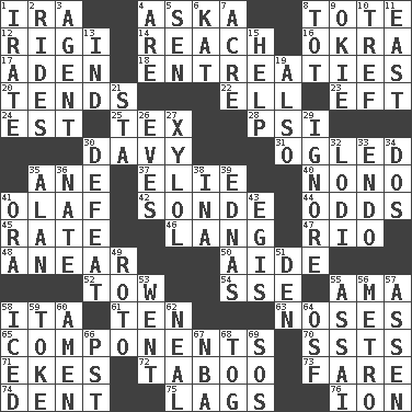 ACROSS 1. Retirement account (abbr.) 4. "____ silly question..." 8. Haul 12. Swiss mountan, "Queen of the Mountains" 14. Arrive at 16. Gumbo ingredient 17. An important port of Yemen 18. Pleas 20. Is inclined (to) 22. Pipe bend 23. Lizard (obsolete) 24. Eastern Standard Time (abbr.) 25. John Ritter's dad 28. 23rd letter of the Greek alphabet 30. American folk hero Crockett 31. Stared 35. A saturated hydrocarbon 37. Writer Wiesel 40. Words to Nanette 41. Norwegian king 42. Message 44. Likelihood 45. Assign a rank or rating to 46. Long (Scottish) 47. River (Sp.) 48. Approach 50. Assistant 52. Pull behind 54. Compass dir. 55. Nursemaid (var.) 58. Call ___ day 61. Nine, plus one 63. Olfactory organs 65. Pieces 70. Fast planes 71. Makes supply last 72. Off limits 73. Conductor's collection 74. Undesirable depression on a surface 75. Straggles 76. Electrically charged atom DOWN 1. Feeling or showing extreme anger 2. Amusement-park features 3. Representative 4. "We ___ not amused" (Victoria) 5. Elected rep. 6. Krazy ___ of comics 7. Land measure 8. Small child 9. Migrant worker of the '30s 10. Not kosher 11. 90 degrees 13. Indiana (abbr.) 15. Assist 19. In addition 21. R.R. building 26. Nights before holidays 27. Xylene (variant) 29. Refuse to acknowledge 30. Outscore 32. Farming town in central California 33. Inside; within (prefix) 34. Two (Sp.) 35. Actor Alda or Thicke 36. Nathan's nickname 38. _ tizzy (2 wds.) 39. Ferber et al. 41. Mouth or opening 43. Armor plate that protects the chest 49. Printing process, for short 51. Lair 53. Left 55. Slender Brazilian palm 56. Paris' subway 57. NE Netherlands city 58. On the rocks 59. Puff or smoke 60. So be it 62. Actress Patricia 64. Order of Saint Francis (abbr.) 66. Pacific Standard Time (abbr.) 67. Basketball assoc. 68. Coat; cloak 69. Distress signal