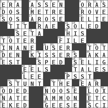 ACROSS 1. Epoch 4. NE Netherlands city 9. Mouths or openings 13. Two (Sp.) 14. Distance measurement (Brit.) 15. Be footloose 16. Mayday 17. Came up 18. Writer Wiesel 19. Teat (slang) 21. Actress Charlotte 22. Having a sole or soles 24. Bristle 26. Part of HMS, perhaps 27. Carrier 29. Do some clerical work 30. Empty; void 31. One who uses or employs something 33. Small child 36. Lair 37. Smoochers 40. Alias (abbr.) 41. Eastern Standard Time (abbr.) 42. Hurried 43. Major League Baseball Commissioner Bud 45. Snakelike fish 47. Stories 48. Area sheltered from the wind 49. Inconspicuous attention getter 50. Difficult or unusual or dangerous feat 52. Definite Article 54. Hearing organ 56. Wrote a lyric poem 57. Trap for birds or small mammals 59. Brine-cured salmon 61. Nathan's nickname 62. ID or VA city 63. And so on (abbr.) 64. Made supply last 65. Honkers 66. _-fi DOWN 1. Begley and Asner 2. Carrot, for example 3. Aide 4. Wet nurse (var.) 5. Father Junipero _ 6. Portico 7. Celtic language 8. Born 9. Threatening words 10. Hero or heavy, e.g. 11. Enthusiastic 12. Observe 20. Adolescent 22. Bake eggs in their shells 23. Petroleum 25. Long journey 27. Event that recurs at intervals 28. Washington bills 29. Nourish 31. United States Postal Service (abbr.) 32. Compass dir. 33. Baron Munchausen's specialties 34. Migrant worker of the '30s 35. Labels 38. Small island 39. Fast planes 44. Relaxation 45. Dodged 46. Car or cant ending 49. Mexican monetary units 50. Neighbor of Neb. 51. Wig 52. Heavy book 53. Dwelling 55. College mil. group 56. Single 57. Tired old horse 58. Compass dir. 60. One more than ninety