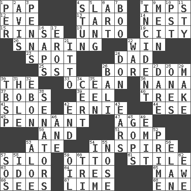 ACROSS 1. Infant food 4. Broad, flat, thick piece 8. Naughty children 12. First lady 13. Edible starchy tuberous root 14. Egg locale 15. Wash lightly 18. To (old English) 19. Municipality 20. Catching in a trap 22. Victory 23. Blemish 24. Male parent 25. Fast jet (abbr.) 26. Mood resulting from idleness 30. Definite Article 33. Sea 36. Nanny 37. Moves up and down 39. Snakelike fish 40. Long journey 41. _ gin 42. Bert's buddy 44. Compass dir. 45. Pre-World Series prize 47. Ripen 50. Plus 51. Frolic 53. Had dinner 54. Heighten or intensify 57. Grain storage tower 59. Von Bismarck 61. Vertical member of a panel or frame 63. Scent 64. Angers 65. Opening into something insatiable 66. Perceives with the eye 67. Citrus frut 68. Compass dir. DOWN 1. For each 2. Advice 3. Actor Sean's family 4. Astound 5. Long (Scottish) 6. Tate display 7. Sometimes accompanies a hiss 8. Event 9. Chow _ 10. Pacific Standard Time (abbr.) 11. Filthy place 16. Plant excrements 17. Greek god of love 21. "Tell ____ the Marines!" 22. Armed conflict 24. Spanish title 26. Indonesian resort city 27. Have the gumption 28. Washington bills 29. Create 30. Cook's measure (abbr.) 31. Hollow 32. Inky black, to poets 34. Sure thing 35. Car or cant ending 38. Elected representatives 42. Conclusion 43. Hearing organs 46. One (Scot) 48. Republicans 49. Send forth 52. First class 53. Medicinal plant 54. Detail 55. Characteristic smell of wine 56. Liveliness 57. Mayday 58. Binary compound 59. Lubricate 60. Three (prefix) 62. She-sheep