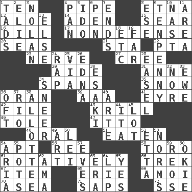 ACROSS 1. Nine, plus one 4. Corncob 8. Inactive volcano in Sicily 12. Medicinal plant 14. Arabian gulf 15. Scorch 16. Deli pickle 17. Unrelated to defense, as in spending 20. Oceans 21. R.R. building 22. Parent Teacher Assoc. 23. Effrontery 27. Algonquian 29. Assistant 31. Queen of England 1702-14 34. Connects, as a bridge 35. Overwhelm 36. Northwest Algerian city 39. Auto club (abbr.) 41. Jane of fiction 42. Do some clerical work 43. Shrimp-like planktonic crustaceans 46. Lacquered or enameled metalware 47. "Tell ____ the Marines!" 48. Spoken 51. Ingested 54. Fitting 56. To riddle 58. "Corrida" creature 61. Producing rotation 66. Long journey 67. A distinct part 68. One of the Great Lakes 69. Mine, in Marseilles 70. At sea 71. Plant excrements 72. Compass dir. DOWN 1. Small boys 2. Writer Wiesel 3. Pitcher Ryan 4. Baking dish 5. Wedding promise 6. Animal enclosure 7. Extremities 8. Compass dir. 9. 3-inch nail 10. Political cartoonist Thomas 11. Length times width 13. Otherwise 18. And so on (abbr.) 19. At a great distance 24. Reproach for some lapse or misdeed 25. By way of 26. Pulitzer Prize-winning author Ferber 28. Artist's stand 30. 1973 Nobel Price Winner (Physics) Leo 32. Not either 33. She-sheep 34. Contemptuous expression 36. Often (poetically) 37. _ de Janeiro 38. One to whom something is allotted 40. Johnson of "Laugh-In" 44. Call ___ day 45. Car dealer's back yard 49. Nonscientific branch of learning 50. Luau accessory 52. Singer James 53. Typical standards 54. Roberta Peters solo 55. Cooking vessels 57. Nights before holidays 59. Vintage cars 60. Migrant worker of the '30s 62. Nursemaid (var.) 63. Period 64. Mouth edge 65. It is so