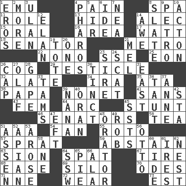 ACROSS 1. Australian flightless bird 4. Ache 8. Health resort 11. Hero or heavy, e.g. 13. Flintstone garb 14. Actor Baldwin 15. Taken by mouth 16. Type of rug 17. Electrical Unit 18. Elected representative 21. Paris' subway 22. Words to Nanette 23. Compass dir. 25. A really long time 26. Gear tooth 29. One of the two male reproductive glands 32. Having winglike extensions 34. Retirement account (abbr.) 35. "One Day ___ Time" 38. Dad 39. Music written for nine 41. Without 43. Opposite of masc. 44. Curve 45. Check the growth or development of 46. Elected representatives 50. Beverage made from leaves 51. Auto club (abbr.) 54. Air blower 55. Printing process, for short 57. Small fatty European fish 59. Choose not to consume 63. The Jewish people; Israel 64. Petty quarrel 67. Hoop that covers a wheel 68. Comfort 69. Grain storage tower 70. Lyric poems 71. Compass dir. 72. Erode 73. Eastern Standard Time (abbr.) DOWN 1. Greek god of love 2. Greater amount 3. Uhlan (variant) 4. N Egypt peninsula 5. Atmosphere 6. Binary compound 7. Teachers' org. 8. Chalkboard 9. Stone: prefix 10. Gambison 12. Enthusiasm 14. Deep reverence 19. Carryall 20. Single 21. Cartoonist voice _ Blanc 23. Title for a man of rank and authority 24. Get outta here! 26. Head covering 27. Norwegian king 28. Stare wonderingly 30. Colored lightly or faintly 31. Compass direction 33. Scottish caps 36. Pulled tight 37. Singer Murray 39. Nanny 40. Northwest Algerian city 42. R.R. building 45. Fast planes 47. Bank Draft (abbr.) 48. Speaker 49. Director Reiner 51. NE Netherlands city 52. Bee-related 53. Came up 56. Von Bismarck 58. A saturated hydrocarbon 60. Assistant 61. Angers 62. Egg locale 64. Compass dir. 65. Sliced dessert 66. Chicken ___ king