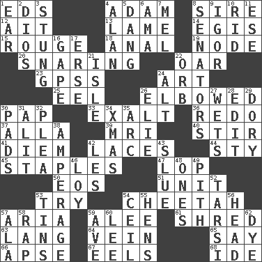 ACROSS 1. Begley and Asner 4. First of billions? 8. Father 12. Small island 13. Unable to walk 14. Armor plate that protects the chest 15. Makeup applied to the cheeks 18. Of or related to the anus 19. Thickened enlargement 20. Catching in a trap 22. Rowing implement 23. Global Positioning Systems (abbr.) 24. Nonscientific branch of learning 25. Snakelike fish 26. Shoved, as through a crowd 30. Infant food 33. Honor 36. Do over again 37. Silent film actress Nazimova 39. Medical imaging device (abbr.) 40. Commotion 41. South Vietnam president (1954) 42. Shoestrings 44. Filthy place 45. Paper fasteners 47. Chop off 50. Greek goddess of the dawn 51. A single undivided whole 53. Attempt to accomplish something 54. Leopard's kin 57. Operatic vocal solo 59. Toward shelter 61. Tear up 63. Austrian-born American filmmaker Fritz 64. Distinctive style or manner 65. Declare 66. Domed church section 67. Snakelike fish 68. Binary compound DOWN 1. Hearing organ 2. "Vaya con ____" 3. Feeling sharp psychological pain 4. Actor Alda or Thicke 5. Mild oath, euphamism for damn 6. Housemaid (var.) 7. Cartoonist voice _ Blanc 8. Legislators 9. Russian composer Stravinsky 10. To free from 11. Compass dir. 16. Stare wonderingly 17. Celtic language 21. Capri or Wight 22. Globe 24. Keyboard modifier key 26. Writer Wiesel 27. Soaks 28. Prepare for publication 29. Rowboat 30. Groovy apts. 31. Set down 32. Entreaty 34. Dec. holiday 35. Curve 38. Electrical Measurement 42. French article 43. Change direction abruptly 46. Myrna of the movies 48. Washington bills 49. Heart or essence 52. Tarsus (plural) 53. Airtight sealed metal containers 54. To provide with a ceiling 55. Coop moms 56. Froth on beer 57. In the manner of 58. Hit sharply and swiftly 59. "___ Maria" 60. Area sheltered from the wind 62. Color