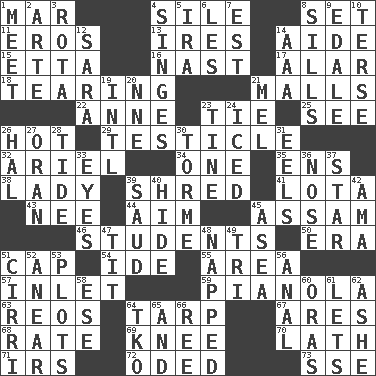 ACROSS 1. Spoil 4. Filth; sediment 8. Put into a specified state 11. Greek god of love 13. Angers 14. Helper 15. Singer James 16. Political cartoonist Thomas 17. Having or resembling wings 18. Rending 21. Promenades 22. Queen of England 1702-14 23. Standoff 25. Perceive with the eye 26. Being at a high temperature 29. One of the two male reproductive glands 32. Satellite of Uranus 34. Single 35. Followers of ems 38. Kenny Rogers chart-topper in '80 39. Fragment 41. Globular water bottle used in Asia 43. Born 44. Direct toward a target or goal 45. Indian state 46. SAT takers 50. Epoch 51. Head covering 54. Binary compound 55. Type of rug 57. An arm off of a larger body of water 59. Player piano 63. Vintage cars 64. Canvas cover 67. Ancient Greek god of war 68. Pace 69. Leg joint 70. Thin strip of wood or metal 71. Big collection agency 72. Wrote a lyric poem 73. Compass dir. DOWN 1. Rendezvous 2. Johnson of "Laugh-In" 3. Round or rotation of duties 4. Scorches 5. Lyricist Gershwin 6. French article 7. Eastern Standard Time (abbr.) 8. Beverly of Met fame 9. Peak District village in England 10. Laconic 12. "Two Mules for Sister ____" 14. Auto club (abbr.) 19. International (abbr.) 20. Compass dir. 21. Cartoonist voice _ Blanc 23. Prong on a fork 24. On the rocks 26. Actor Linden 27. NW Algerian seaport 28. Periodic rise and fall of the sea level 30. Singer Mel 31. Snakelike fish 33. Sight organs 36. Sense of smell 37. Play the lead 39. Saudi Arabian king (1953-1964) 40. Flintstone garb 42. Nursemaid (var.) 45. Toward the sea 47. Teat (slang) 48. Slept 49. Three (prefix) 51. High-altitude cloud 52. Approach 53. Small pieces of grounds 56. Of or related to the anus 58. Compass dir. 60. Mouths or openings 61. Allows 62. American tennis player Robert 64. Ring climax 65. Plus 66. To separate or throw off
