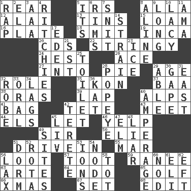 ACROSS 1. Located in or toward the back 5. Big collection agency 8. Silent film actress Nazimova 12. Jai ____ 13. Metal containers 15. Rich soil 16. Food holder 18. Stricken, poetically 19. South American Indian 20. Music discs 22. Slender, wiry 24. Behest 26. Adept person 27. To the inside or interior of 28. Sliced dessert 29. Grow older 32. Hero or heavy, e.g. 35. Visual representation of an object 37. Sound made by sheep 38. Mouths or openings 39. Pet locale 40. High mountains 41. Paper or plastic container 42. Wig 43. Confront 44. Raised railways 45. Allow 46. Sharp bark 49. Title for a knight 50. Writer Wiesel 51. Popular '50s hangout 55. Impair 56. Spoils 57. A blast of a horn 59. Indian princess (variant) 63. Johnson of "Laugh-In" 64. Inside; within (prefix) 65. Eighteen holes 66. Dec. holiday 67. Arrange properly for use 68. Prepare for publication DOWN 1. Reproach for some lapse or misdeed 2. Pipe bend 3. Auto club (abbr.) 4. Actors Guy, Robert Welles, and Clint 5. ___ a Wonderful Life 6. Basketball hoops 7. In a ____ (agitated or irritated) 8. Place in a line 9. Protracted 10. Made of lace 11. Wet nurse (var.) 14. Put through a sieve 17. Locale of original sin 21. Fast jet (abbr.) 23. Frozen water 25. Rest room 28. Wimpy's pal 29. Competent 30. Stare wonderingly 31. 90 degrees 32. Loose flowing garment 33. Spoken 34. Straggles 36. Krazy ___ of comics 40. Electrical Measurement 42. Cylindrical with tapered ends 45. 54 in ancient Rome 47. Shade tree 48. One who doesn't tell the truth 49. Settings 51. Dormintory (informal) 52. Round or rotation of duties 53. Charged atoms 54. Connecting point 56. Not strict 58. Small child 60. Dreamland 61. Biblical high priest 62. Newt