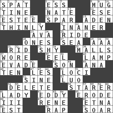 ACROSS 1. Argument over a trivial matter 5. Double-curved letter 8. Java container 11. Prong on a fork 12. Nathan's nickname 14. Compass dir. 15. First name in cosmetics 17. Coast Guard woman 18. An important port of Yemen 19. Without force or sincere effort 21. More empty; more void 23. Actress Gardner 25. Travel on an animal 26. Singles 27. Ocean 28. American Automobile Association (abbr.) 31. To free from 33. Like a shrinking violet 35. Shopping centers 37. Had on 38. Snakelike fish 40. Desk light 41. Elude 43. Boy, to dad 45. Santa ___, CA 46. "___ Little Indians" 47. French article 50. Venues 52. Trig term 53. Nilotic language 54. Keyboard key 56. A viewer who gazes fixedly 61. Kenny Rogers chart-topper in '80 62. Whirlpool 65. Wear away 66. One more than two 67. French philosopher Descartes 68. Inactive volcano in Sicily 69. Eastern Standard Time (abbr.) 70. Hit sharply and swiftly 71. Fly high DOWN 1. Proofreading order 2. Expression of disdain 3. Opposed to 4. Adolescent 5. Followers of ems 6. Plant excrement 7. Flight of steps 8. Ancient Persian 9. One who makes use of a thing 10. Commissioned military rank (abbr.) 13. Bert's buddy 16. Flair 18. One (Scot) 20. Jacques Cousteau's middle name 22. First man 24. American tennis player Robert 26. Wrote a lyric poem 28. Actor Alda or Thicke 29. _ mater 30. Viper 31. Be footloose 32. SW Asia republic 34. Consenting reply 36. Mountain range southwest of Kyrgyzstan 37. Soggy 39. Hang loosely or laxly 42. Writer Wiesel 44. Common sense 48. Keyboard key 49. Sowing specialist 51. ____ d'Azur (French Riviera) 52. Mischievous 54. Raised platform 55. Prepare for publication 57. Ancient Greek god of war 58. Printing process, for short 59. Pulitzer Prize-winning author Ferber 60. Bring up, as a child 61. Falsehood 63. Heredity factor (abbr.) 64. Slangy assent