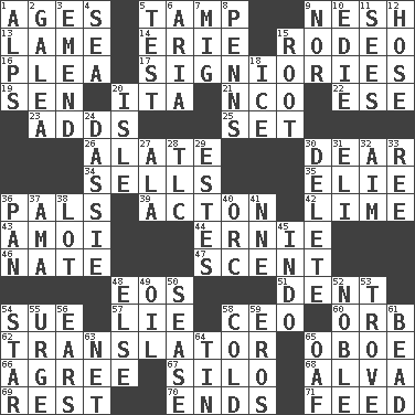 ACROSS 1. Eons 5. Pack (down) 9. Delicate 13. Unable to walk 14. One of the Great Lakes 15. Cowboy competition 16. Entreaty 17. Seigniories (variant) 19. Elected rep. 20. Call ___ day 21. Non-commissioned officer (abbr.) 22. Compass dir. 23. Does sums 25. Put into a specified state 26. Having winglike extensions 30. Letter starter 34. Makes a sale 35. Writer Wiesel 36. Friends 39. NE Massachussets city 42. Citrus frut 43. Mine, in Marseilles 44. Bert's buddy 46. Nathan's nickname 47. Aroma 48. Greek goddess of the dawn 51. Undesirable depression on a surface 54. Institute legal proceedings 57. Untruth 58. Corporate head (abbr.) 60. Globe 62. Interpreter 65. Mitch Miller's instrument 66. Match 67. Grain storage tower 68. Inventor's middle name 69. Repose 70. Conclusions 71. Nourish DOWN 1. High mountains 2. An organ shaped like a helmet 3. Make improvements or corrections to 4. Ocean 5. Trial 6. Operatic vocal solo 7. Russian fighter aircraft 8. Actor Sean's family 9. And not 10. Singer Brickell 11. Perceives with the eye 12. Flexible conduit 15. Carrot, for example 18. Frozen water 20. Small island 24. Hyrax 27. Wing 28. Affectionate concern, for short 29. _____ Park, CO 30. Keyboard key 31. Biblical high priest 32. Direct toward a target or goal 33. Portuguese money of account (variant) 36. Baking dish 37. Wet nurse (var.) 38. Car dealer's back yard 40. The grampus (Milton) 41. Compass dir. 45. _ china 48. Otherwise 49. Lubricate 50. Gospel singer Marvin 52. Impressive in appearance 53. Collection of objects 54. Play the lead 55. Goad 56. Hearing organs 58. Chilled 59. Greek god of love 61. Necklace unit 63. Remaining after all deductions 64. Metal container 65. Clumsy lout