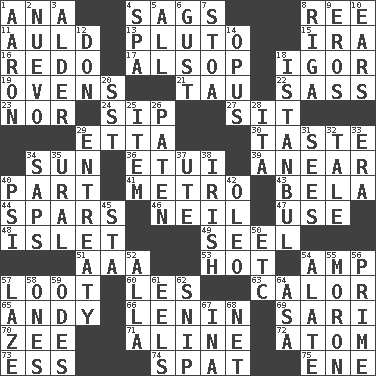 ACROSS 1. Santa ___, CA 4. Droops 8. To riddle 11. Old (Scot.) 13. Greek god of the underworld 15. Retirement account (abbr.) 16. Make new 17. Columnist Joseph or Stewart 18. Composer Stravinsky 19. Baking chambers 21. The 19th letter of the Greek alphabet 22. Backtalk 23. Not either 24. Small drink 27. Be seated 29. Singer James 30. Clothes sense 34. Player for Phoenix 36. Needle case 39. Approach 40. Component 41. Paris' subway 43. Actor Lugosi 44. Practice fights 46. Famous astronaut Armstrong 47. Purpose 48. Small island 49. Sew up the eyelids of hawks and falcons 51. American Automobile Association (abbr.) 53. Being at a high temperature 54. Electrical Unit 57. Spoils 60. French article 63. Bodily heat indicating an inflammation 65. "60 Minutes" Commentator Rooney 66. Soviet premier 1918-24 69. Indian skirt 70. Last letter of the English alphabet 71. Place in a line 72. Tiny particle 73. Curvy letter 74. Petty quarrel 75. Compass dir. DOWN 1. Composer Copland 2. New (sp.) 3. Tree or shrub in the Birch family 4. Health resort 5. Everything 6. Abrupt rush of wind 7. Portico 8. Port city in Latvia 9. Greek god of love 10. Hearing organs 12. Spanish title 14. Musical composition 18. Byzantium, centuries later 20. Fast jet (abbr.) 25. A whole individual unit 26. Eucharist need 28. Call ___ day 29. Plea 31. Perceives with the eye 32. Falsehood 33. Epoch 34. Plant excrements 35. Mountain range 37. Shoshoni 38. From or relating to Ireland 40. Air pressure measure (abbr.) 42. Butter sub 45. R.R. building 50. And so on (abbr.) 52. Silent film actress Nazimova 54. Having winglike extensions 55. Person of subnormal intelligence 56. A-one 57. Goldbrick 58. Washington bills 59. Lyric poems 61. Snakelike fish 62. Clip 64. White ___ sheet 67. _ tizzy (2 wds.) 68. Fish or hair follower