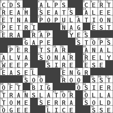 ACROSS 1. Music discs 4. High mountains 8. Sure thing 12. 480, 500 or 516 sheets of paper 14. Theater features 16. Toward shelter 17. Inactive volcano in Sicily 18. Census information 20. _ dish (used to culture cells) 22. Tired old horse 23. Eastern Standard Time (abbr.) 24. Period 25. Hit sharply and swiftly 28. It is so 30. Yawn 31. Halts 35. For each 37. Russian ruler of old 40. Of or related to the anus 41. Inventor's middle name 42. Underwater navigation system 44. Trust 45. Shed a tear 46. The founder of a family 47. Compass dir. 48. Artist's stand 50. Engineer (abbr.) 52. "Barney Miller" actor Jack 54. Friend of Pooh 55. Fast jet (abbr.) 58. Often (poetically) 61. Large 63. Flexible twig of a willow tree 65. Interpreter 70. Water jar 71. Heavy book 72. Spanish missionary in California 73. Disposed of to a purchaser 74. Double curve, resembling the letter S 75. Louse (plural) 76. Compass dir. DOWN 1. Streamer paper 2. Prevent from occurring 3. Before Barbara or Clara 4. Cleo's killer 5. Lion 6. Infant food 7. Make senseless or dizzy 8. Domesticated feline 9. Writer Wiesel 10. Vintage cars 11. Portable shelter 13. Make imperfect 15. Kill 19. Ripens 21. Retirement account (abbr.) 26. Tenement units (abbr.) 27. Mexican monetary units 29. A viewer who gazes fixedly 30. Raisin fruits 32. Washington bills 33. Light colored 34. Cunning 35. Entreaty 36. Nights before holidays 38. Cuckoo 39. Less widely known 41. Deep reverence 43. Former U.S. Attorney General Janet 49. Tennis shots 51. Thick or sticky substance 53. Lubricates 55. Grain storage towers 56. Exchanges for money 57. Swap 58. "Beetle Bailey" pooch 59. Tree-dwelling hopper 60. Not wild 62. Highlander 64. Mayday 66. Born 67. Three (prefix) 68. The grampus (Milton) 69. Actress Charlotte