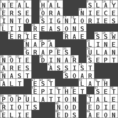 ACROSS 1. Anneal 5. Actor Linden 8. Kill 12. Celtic language 13. Mouth or opening 14. Sibling's daughter 15. To the inside or interior of 16. Seigniories (variant) 19. Cards in a Roman deck? 20. Thinks logically 21. 4th largest of the Great Lakes 23. Actress Charlotte 24. Compass dir. 27. California wine valley 30. Actor's bit 31. Raisin fruits 34. ____ Bator 35. Short letter 38. Middle Eastern gold or silver currency 40. Back-to-school mo. 41. Ancient Greek god of war 42. Help 44. Political cartoonist Thomas 45. Fly high 46. The first octave above the treble staff 47. Eastern Standard Time (abbr.) 50. Thin strip of wood or metal 53. Curse 57. Arrange properly for use 59. Census information 63. Falsehood 64. Disturbances 65. Dreamland 66. Singer Brickell 67. Writer Wiesel 68. Begley and Asner 69. Period of immesurable duration DOWN 1. Famous astronaut Armstrong 2. Bert's buddy 3. Having gotten out of bed 4. Lion 5. Stockings 6. Operatic vocal solo 7. Straggles 8. Title for a knight 9. Luau accessory 10. Adept person 11. It is so 14. Sense of smell 17. And not 18. _ tizzy (2 wds.) 20. Hitchcock's "____ Window" 22. Swallow 24. Drop; flow; fall 25. Fastener 26. Left 28. Writing tablet 29. Capital of Western Samoa 30. A period of five years 32. Followers of ems 33. Backtalk 35. Grandmother 36. Of the mouth 37. Trial 39. _ de Janeiro 43. Table seasoning 47. Snakelike fish 48. Health resort 49. Teat (slang) 51. Sadhe (variant) 52. Sun: prefix 54. Prong on a fork 55. Parka part 56. Conclusions 58. Adolescent 59. Before (prefix) 60. Lubricate 61. Luau course 62. Shoshoni 63. Afternoon social gathering
