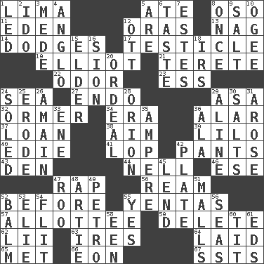 ACROSS 1. Pale green bean 5. Had dinner 8. Bear (Spanish) 11. Paradise 12. Mouths or openings 13. Tired old horse 14. Evades 17. One of the two male reproductive glands 19. American author Paul (1891-1958) 21. Cylindrical with tapered ends 22. Aroma 23. Double-curved letter 24. Ocean 27. Inside; within (prefix) 29. White ___ sheet 32. Abalone 34. Period 36. Having or resembling wings 37. Grant temporary use of 38. Direct toward a target or goal 39. _ and Stitch 40. Singer Brickell 41. Trim (branches) 42. Leg coverings 43. Lair 44. 1994 drama film starring Jodie Foster 46. Compass dir. 47. Strike 50. 480, 500 or 516 sheets of paper 52. Prior to 55. Gossips 57. One to whom something is allotted 59. Erase 62. Cards in a Roman deck? 63. Angers 64. Put down 65. Was introduced to 66. A really long time 67. Fast planes DOWN 1. Directed 2. Wedding promise 3. Ancient Persian 4. White American of non-Hispanic descent 5. "We ___ not amused" (Victoria) 6. Clothes sense 7. _____ Park, CO 8. Single time 9. Table seasoning 10. Double curve, resembling the letter S 12. Baseball player Mel 15. A person who is older than you are 16. The Jewish people; Israel 18. Big collection agency 20. Severe or trying experience 24. Having a sole or soles 25. Eat (away) 26. At full speed 28. Greek mythologigal hunter 29. Place in a line 30. Table seasonings 31. Came up 33. Compass dir. 35. Electrical Unit 36. Chicken ___ king 42. Food holder 45. Grant temporary use of 47. Friend of Pooh 48. Nick name for Arthur 49. Stone: prefix 51. Shopping centers 52. Lip ointment 53. Writer Wiesel 54. Secret move to avoid paying debts 55. It is so 56. Oceans 58. Car or cant ending 60. Teat (slang) 61. Begley and Asner