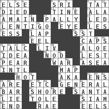 ACROSS 1. Otherwise 5. _ Lanka 8. Make lace 11. Passed on 12. Prong on a fork 14. Insect wing 15. With great haste 17. Chummy 18. Directed 19. Small, flat, pigmented spot on the skin 21. Sight organ 22. French article 23. Curvy letter 24. Infant locale 25. Fast jet (abbr.) 27. Snakelike fish 28. Smile enhancers 31. Baby powder 35. 54 in ancient Rome 37. Medicinal plant 38. It may be bright or harebrained 39. Lower and raise head in agreement 41. For fear that 42. Lightbulb-shaped fruit 43. Armed conflict 45. At sea 46. International (abbr.) 47. Atlas unit 49. Being at a high temperature 51. Alias (abbr.) 52. Followers of ems 55. "We ___ not amused" (Victoria) 57. And so on (abbr.) 60. Commissioned military rank 62. Drinking establishment 63. Dinah or Pauly 65. Before Barbara or Clara 66. Falsehood 67. Lacquered or enameled metalware 68. Thailand, formerly 69. Conclude 70. Actress Charlotte 71. Snakelike fish DOWN 1. Peak District village in England 2. Citrus fruits 3. Actors Connery and Penn 4. Prepare for publication 5. R.R. building 6. Cause heat under the collar 7. Inwardly 8. Baron Munchausen's specialties 9. Toward shelter 10. Bits 13. Snake ____ (dice throw) 16. Mediterranean tributary 17. Cotton for raincoats, e.g. 20. Highlander 26. Any of the three canals of the cochlea 29. Introduce or present, as a question 30. Stalk of a moss capsule 31. Native american tent (variation) 32. An important port of Yemen 33. Tough but pliablecoriaceous 34. Monte _, Las Vegas Hotel/Casino 36. Solemn pledge 40. Break 44. Libertine 48. Baking dishes 50. Trial 52. Bert's buddy 53. Brizilian seaport 54. Shuts with force 55. Competent 56. Precipitation 58. Son of Odin 59. Root beer relative 61. Relaxation 64. Portuguese money of account (variant)