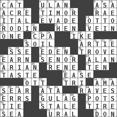 ACROSS 1. Feline 4. ____ Bator 8. White ___ sheet 11. 43,560 square feet 13. Southeast Indonesia island 15. Actress Charlotte 16. Slanted text style (abbr.) 17. Elude 18. "Beetle Bailey" pooch 19. "The Thinker" sculptor 21. Layer 22. Distinctive style or manner 23. Single 24. Tax preparer (abbr.) 27. D.D.E's nickname 29. Earth 30. Nick name for Arthur 34. Compass dir. 36. Locale of original sin 39. Collection of objects 40. Merit 41. Sir (Sp.) 43. Actor Alda or Thicke 44. Believer in; advocate of (suffix) 46. French philosopher Descartes 47. Nine, plus one 48. Clothes sense 49. Relaxation 51. Baseball player Mel 53. Three (prefix) 54. Nanny (var.) 57. Singe 60. _ moment's notice (2 wds.) 63. All-night dance parties 65. Blunders 66. POW camp 69. Plant holders 70. Neckwear 71. Having lost freshness 72. Hoop that covers a wheel 73. Ocean 74. Mountain range 75. Spanish title DOWN 1. Capital of Egypt 2. NE Massachussets city 3. Exchange 4. Shoshoni 5. 54 in ancient Rome 6. Wet nurse 7. Connecting point 8. Johnson of "Laugh-In" 9. Suttee (variant) 10. Period of immesurable duration 12. Connecticut Ivy Leaguer 14. Painter Guido (1575-1642) 18. Make much ado about nothing 20. Non-commissioned officer (abbr.) 25. Sliced desserts 26. Tree or shrub in the Birch family 28. Krazy ___ of comics 29. Legislators 31. Lacquered or enameled metalware 32. "Terrible" tsar 33. Car or cant ending 34. "Two Mules for Sister ____" 35. Indian titles of respect 37. Compass dir. 38. Music written for nine 40. Ingest 42. Posterior 45. Remaining after all deductions 50. Title for a knight 52. Labels 54. Prevent from happening 55. Paris' subway 56. NE Netherlands city 57. Puts into a specified state 58. 4th largest of the Great Lakes 59. Type of rug 61. Ballerina skirt 62. Having or resembling wings 64. Fitting 67. Wing 68. Set