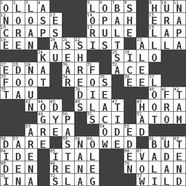 ACROSS 1. Spanish pot 5. Tennis shots 9. Attila the _ 12. Trap for birds or small mammals 14. Brightly colored fish 15. Epoch 16. Dice game 17. Governing power 18. Pet locale 19. Car or cant ending 20. Help 23. Silent film actress Nazimova 24. Malaysian steamed pastry 25. Grain storage tower 27. Pulitzer Prize-winning author Ferber 30. Sandy's bark 32. Adept person 33. 12 inches 34. Vintage cars 36. Snakelike fish 38. The 19th letter of the Greek alphabet 39. Pass on 40. Often (poetically) 43. Dreamland 46. Narrow board 48. Israeli folk dance 49. Flimflam 51. _-fi 52. Smallest unit of an element 53. Length times width 54. Wrote a lyric poem 56. Have the gumption 58. Frozen precipiation fell 61. On the contrary 64. Binary compound 65. Slanted text style (abbr.) 66. Dodge 68. Lair 69. French philosopher Descartes 70. Pitcher Ryan 71. _ tizzy (2 wds.) 72. Volcanic refuse 73. Rampant DOWN 1. Single time 2. Old wives' tales, e.g. 3. Grant temporary use of 4. Cleo's killer 5. Australian parrot (variant) 6. Musical composition 7. Greek mezzo-soprano Agnes 8. A female animal or person 9. Phone greeting 10. Mountain range 11. California wine valley 13. He sold his birthright 21. Scorch 22. Fragments 23. Toward shelter 24. Krazy ___ of comics 26. Frozen water 27. Newt 28. ___ good deed 29. Part of speech 31. Fencing necessities 35. Manatee 37. Spoils 41. Away 42. Scottish cap 44. Legendary monster 45. Color 47. Periodic rise and fall of the sea level 48. Possessed 50. Soft color 53. Sports stadium 55. Locale of original sin 56. "You Light Up My Life" star Conn 57. Arabian gulf 59. Nanny 60. Cassini of fashion 61. Indonesian resort city 62. Allodial 63. Be inclined (to) 65. Big collection agency 67. Solemn pledge