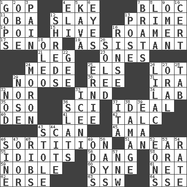 ACROSS 1. Republican Party 4. Make supply last 7. Alliance 11. Chief or king in Benin or Nigeria 12. Kill 13. First class 14. Luau course 15. Hub of activity 16. Wanderer 17. Sir (Sp.) 19. Aide 21. Part of a journey 23. Singles 24. Ancient Persian 25. Raised railways 26. Car dealer's back yard 29. Trap for birds or small mammals 30. To riddle 31. Lyricist Gershwin 32. Not either 33. Working for oneself (abbr.) 34. Experiment locale 35. Bear (Spanish) 36. _-fi 37. Standard of perfection 40. Lair 41. Area sheltered from the wind 42. Baby powder 43. Examine hastily 45. Nursemaid (var.) 46. Drawing lots 51. Approach 55. Foolish or stupid persons 56. Mild oath, euphamism for damn 58. Mouth or opening 59. Impressive in appearance 60. Unit of force 61. Remaining after all deductions 62. Celtic language 63. Compass dir. 64. Compass dir. DOWN 1. Republicans 2. Mitch Miller's instrument 3. Ache 4. Biblical high priest 5. Polynesian shrub of the pepper family 6. Snake ____ (dice throw) 7. Naughty children 8. Pale green bean 9. Sign of something about to happen 10. An absolute certainty 12. Tears up 13. Airs 16. Remove soap 18. Margarine 20. Having a sole or soles 22. Turn to the right 24. Person of subnormal intelligence 25. Bert's buddy 26. Pale purple color 27. Spoken 28. Keyboard key 29. Olfactory organ 32. Allow head to fall sleepily 33. Ancient Celtic tribe of eastern Britain 36. Narrow boards 37. Call ___ day 38. Break 39. Liveliness 43. Fur scarf 44. Quote 46. Trig term 47. Scent 48. Teases 49. Probability 50. Negative votes 52. Immeasurably long periods of time 53. Ancient Greek god of war 54. Assign a rank or rating to 57. Compass dir.