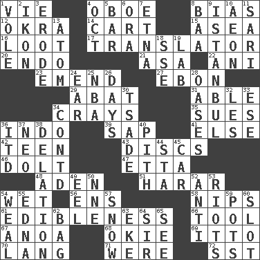 ACROSS 1. Compete 4. Mitch Miller's instrument 8. Prejudice 12. Gumbo ingredient 14. Haul 15. At sea 16. Spoils 17. Interpreter 20. Inside; within (prefix) 21. White ___ sheet 22. Cuckoo 23. Make improvements or corrections to 27. Inky black, to poets 29. Blind as ____ 31. Competent 34. Trading vessels 35. Institutes legal proceedings 36. Southeast Asian peninsula 39. Plant excrement 41. Otherwise 42. Adolescent 43. Flat circles 46. Stupid person 47. Singer James 48. Arabian gulf 51. Ethiopian city, capital of Harari 54. Dripping 56. Followers of ems 58. Pinches, bites 61. The property of being fit to eat 66. Instrument 67. Small Philippine buffalo 68. Migrant worker of the '30s 69. "Tell ____ the Marines!" 70. Austrian-born American filmmaker Fritz 71. Past tense of be (plural) 72. Fast jet (abbr.) DOWN 1. Short-tailed, large-bodied rat 2. Image 3. Eat (away) 4. Sep. follower 5. Drinking establishment 6. Mouth or opening 7. Inactive volcano in Sicily 8. Sound made by sheep 9. Byzantium, centuries later 10. Period of immesurable duration 11. Indian skirt 13. Tiny particle 18. Compass dir. 19. Experiment locale 24. Hearing organ 25. Basketball assoc. 26. 24-hour periods 28. Fertile tracts in a desert 30. Sadhe (variant) 32. French article 33. Compass dir. 34. Continued (abbr.) 36. It would 37. Modern: prefix 38. Accusation by an informer 40. Heart or essence 44. R.R. building 45. 4-wheeled motor vehicle 49. Snakelike fish 50. Compass dir. 52. Against 53. Disturbances 54. Welt 55. Pulitzer Prize-winning author Ferber 57. Overwhelm 59. Plant holders 60. Narrow, elongated depression 62. Container for groceries 63. Make supply last 64. Title for a knight 65. Observe