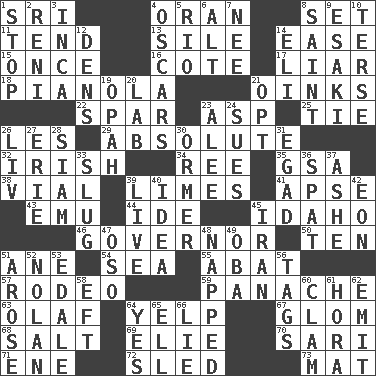 ACROSS 1. _ Lanka 4. NW Algerian seaport 8. Arrange properly for use 11. Watch over 13. Filth; sediment 14. Relaxation 15. At one time in the past 16. ____ d'Azur (French Riviera) 17. One who doesn't tell the truth 18. Player piano 21. Pig sounds 22. Coast Guard woman 23. Viper 25. Standoff 26. French article 29. Utter; complete 32. From or relating to Ireland 34. To riddle 35. Girls' org. (abbr.) 38. Small bottle 39. Citrus fruits 41. Domed church section 43. Australian flightless bird 44. Binary compound 45. Potato state 46. State head 50. Nine, plus one 51. One (Scot) 54. Ocean 55. Blind as ____ 57. Cowboy competition 59. Flamboyance 63. Norwegian king 64. Sharp bark 67. Take by theft 68. Table seasoning 69. Writer Wiesel 70. Indian skirt 71. Compass dir. 72. Downhill vehicle 73. Floor protector DOWN 1. Discontinue 2. Painter Guido (1575-1642) 3. South American Indian 4. Motion picture awards 5. River (Sp.) 6. The first octave above the treble staff 7. Born 8. Inhabitant of Heaven 9. 1973 Nobel Price Winner (Physics) Leo 10. Laconic 12. Habitations of wild animals 14. Connecticut Ivy Leaguer 19. Brightly colored fish 20. Experiment locale 21. Elect 23. Toward shelter 24. Takes to court 26. 54 in ancient Rome 27. 4th largest of the Great Lakes 28. Thailand, formerly 30. Channel Islands abalone 31. Mild oath 33. Snaillike creature with no shell 36. Argument over a trivial matter 37. American tennis player Robert 39. Moving, as bait 40. The content of cognition 42. Period of immesurable duration 45. SW Asia republic 47. Bear (Spanish) 48. Slept 49. Chief or king in Benin or Nigeria 51. Came up 52. Pitcher Ryan 53. Peak District village in England 56. Labels 58. Bank Draft (abbr.) 60. Burrowing marine mollusk 61. Israeli folk dance 62. Send forth 64. Consenting reply 65. Pipe bend 66. Whopper