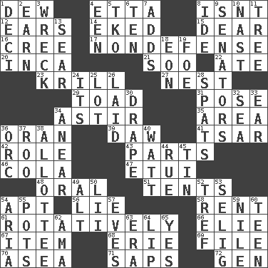 ACROSS 1. Morning condensation 4. Singer James 8. Is not 12. Hearing organs 14. Made supply last 15. Letter starter 16. Algonquian 17. Unrelated to defense, as in spending 20. South American Indian 21. "Barney Miller" actor Jack 22. Had dinner 23. The principal food of baleen whales 27. A home for chicks 29. Frog relative 31. Airs 34. Having gotten out of bed 35. Length times width 36. NW Algerian seaport 39. Fool 41. Russian ruler of old 42. Hero or heavy, e.g. 43. Components 46. Root beer relative 47. Needle case 48. Relating to the mouth 51. Portable shelters 54. Fitting 56. Untruth 58. Monthly bill 61. Happening in regular succession 66. Writer Wiesel 67. A whole individual unit 68. One of the Great Lakes 69. Do some clerical work 70. At sea 71. Plant excrements 72. Commissioned mil. rank DOWN 1. Tenth: prefix 2. Merit 3. Raze 4. Car or cant ending 5. Ring climax 6. Nine, plus one 7. Sums up 8. Binary compound 9. Elected representatives 10. Political cartoonist Thomas 11. Relationship diagram 13. Dry up 18. A really long time 19. Enemy 24. ___ a Wonderful Life 25. Car dealer's back yard 26. Put down 28. Arguments over trivial matters 30. Window treatment 32. Ocean 33. Hearing organ 34. Approach 36. The grampus (Milton) 37. Friend of Pooh 38. One to whom something is allotted 40. Electrical Unit 44. Regret 45. Shallow baking pan 49. The first octave above the treble staff 50. Cards in a Roman deck? 52. Not kosher 53. Former Milwaukee Brewers owner Bud 54. Operatic vocal solo 55. Plant holders 57. Nights before holidays 59. Mediterranean tributary 60. Adolescent 62. Nanny (var.) 63. Period 64. Mouth edge 65. Consenting reply