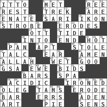 ACROSS 1. "Tell ____ the Marines!" 5. Was introduced to 8. To riddle 11. State of inaction 12. Long journey 14. "We ___ not amused" (Victoria) 15. Related on the mother's side 17. Indian skirt 18. Visual representation of an object 19. Disco prop 21. Eats (away) 23. Baseball player Mel 25. Event that recurs at intervals 26. To the inside or interior of 27. Conclusion 28. Being at a high temperature 31. Baking dish 33. Fitting 35. Fur scarf 37. Baby powder 38. Hearing organ 40. So be it 41. Assad's deity 43. Dripping 45. Thick or sticky substance 46. Girls' org. (abbr.) 47. She-sheep 50. Auction offers 52. Long, evenly shaped pieces 53. Health resort 54. Being or containing an acid 56. Pressed 61. Cassini of fashion 62. Scottish caps 65. Eat (away) 66. Drinking establishment 67. Blunders 68. Arabian gulf 69. Tate display 70. Sliced dessert 71. Elected reps. DOWN 1. Angers 2. Portable shelter 3. Russian ruler of old 4. Von Bismarck 5. Mountains (abbr.) 6. Epoch 7. Cylindrical with tapered ends 8. Libertine 9. Greek god of love 10. Car or cant ending 13. Japanese brewing company 16. Inky black, to poets 18. Binary compound 20. Singer James 22. Probability 24. Drink excessively 26. South American Indian 28. Same (prefix) 29. Butter sub 30. "___ Little Indians" 31. Friends 32. Silent film actress Nazimova 34. The 23rd letter of the Hebrew alphabet 36. Labels 37. Label 39. Confederate soldiers (slang) 42. Froth on beer 44. Native american tent (variation) 48. Compose 49. Fortification 51. Have the gumption 52. Of large size 54. Having or resembling wings 55. An absolute certainty 57. Mouths or openings 58. Connecting point 59. Locale of original sin 60. Habitations of wild animals 61. Chief or king in Benin or Nigeria 63. Medical imaging device (abbr.) 64. Compass dir.