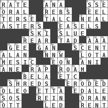 ACROSS 1. Pace 5. Santa ___, CA 8. Compass dir. 11. Spoken 12. Confederate soldiers (slang) 14. Snakelike fish 15. Laconic 17. Baby powder 18. Be tempered by heat 19. Michaelmas daisies 21. Artist's stands 23. What Jean-Claude Killy likes to do 25. Change direction abruptly 26. Located in or toward the back 27. Bit 28. American Automobile Association (abbr.) 31. Unit of force equal to gravity 33. Separate the seeds from cotton 35. Aroma 37. Actor Alda or Thicke 38. Compass dir. 40. Globular water bottle used in Asia 41. Of or pertaining to a meson 43. Period of immesurable duration 45. Black tropical American cuckoo 46. A saturated hydrocarbon 47. Strike 50. Wander aimlessly 52. Actor Lugosi 53. And so on (abbr.) 54. Fragments 56. Eaten away 61. Margarine 62. Singer James 65. Peak District village in England 66. Mayday 67. It's straight from the horse's mouth 68. Northwest Algerian city 69. Baseball player Mel 70. Directed 71. Monthly bill DOWN 1. Round or rotation of duties 2. Ancient Greek god of war 3. Small pie 4. Otherwise 5. Tate display 6. Teachers' org. 7. Most capable 8. Sew up the eyelids of hawks and falcons 9. Oceans 10. Pipe bend 13. Any of the three canals of the cochlea 16. Celtic language 18. Born 20. Heroin 22. Beer foam 24. SW Asia republic 26. Painter Guido (1575-1642) 28. A really long time 29. Against 30. "One Day ___ Time" 31. Small, secluded valley 32. Comfort 34. Compass dir. 36. Dollar (slang) 37. Nursemaid (var.) 39. Had on 42. Algonquian 44. Make mention of 48. Tree or shrub in the Birch family 49. Soft color 51. Measure of real estate 52. Sis' sibling 54. Slit 55. Command 57. Scent 58. Have the gumption 59. Liveliness 60. Undesirable depression on a surface 61. Bear (Spanish) 63. Neckwear 64. Added to