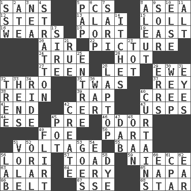 ACROSS 1. Without 5. Personal Computers (abbr.) 8. Toward the sea 12. Proofreading order 13. Jai ____ 15. Hang loosely or laxly 16. Puts on (as clothing) 18. Left side of a ship or aircraft 19. 90 degrees 20. Wind 22. Photo 24. Loyal 26. Being at a high temperature 27. Adolescent 28. Allow 29. She-sheep 32. Through, poetically 35. It was, poetically 37. Marina Del _, California 38. It's straight from the horse's mouth 39. Strike 40. Algonquian 41. Conclude 42. An absolute certainty 43. United States Postal Service (abbr.) 44. Compass dir. 45. Before (prefix) 46. Aroma 49. Enemy 50. Piece 51. Electrical Measurement 55. Sound made by sheep 56. Australian parrot (variant) 57. Frog relative 59. Sibling's daughter 63. Having or resembling wings 64. Suggestive of the supernatural 65. California wine valley 66. Waist strap 67. Compass dir. 68. Play the lead DOWN 1. Compass dir. 2. Had dinner 3. Teachers' org. 4. Ski resort town in Vermont 5. Infant food 6. Hoof sound 7. Indian skirt 8. Eskimo relative 9. Fly high 10. Otherwise 11. Keyboard modifier key 14. Irritating cutaneous sensations 17. Title for a man of rank and authority 21. Regret 23. Small child 25. Main course 28. Portable computer 29. Blunders 30. Shed a tear 31. Sight organs 32. Woody plant 33. Coop moms 34. Travel on an animal 36. Armed conflict 40. Window treatments 42. Cause to be 45. Plant holder 47. Apply (a substance) by light strokes 48. Northwest Algerian city 49. Talk or behave amorously 51. Short-tailed, large-bodied rat 52. Relating to the mouth 53. Moves 54. Hearing organs 56. Experiment locale 58. Color 60. Erode 61. Tax preparer (abbr.) 62. Hearing organ
