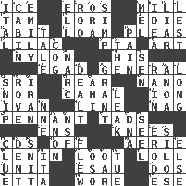 ACROSS 1. Frozen water 4. Greek god of love 8. Place where flour is made 12. Scottish cap 13. Australian parrot (variant) 14. Singer Brickell 15. "This won't hurt ____!" 17. Rich soil 18. Entreaties 19. Pale purple color 21. Parent Teacher Association (abbr.) 23. Nonscientific branch of learning 24. Thermoplastic polyamide 26. Part of HMS, perhaps 28. Mild oath 30. Commissioned military rank 34. Indian title of respect (Mr.) 37. Located in or toward the back 39. Billionth: prefix 40. And not 41. Lessep's creation 43. Electrically charged atom 44. _ the terrible 46. Actor's bit 47. Tired old horse 48. Pre-World Series prize 51. Small boys 54. Followers of ems 55. Leg joints 58. Music discs 61. Not in operation 63. Nest on high 65. Soviet premier 1918-24 67. Plunder 71. Hang loosely or laxly 72. A single undivided whole 73. Son of Isaac 74. Two (Sp.) 75. Singer James 76. Had on 77. Compass dir. DOWN 1. Slanted text style (abbr.) 2. Apartment or room in a ship 3. Poet Dickinson 4. Pipe bend 5. Friend of Pooh 6. Mouth or opening 7. Simple or foolish person 8. Cartoonist voice _ Blanc 9. The main thing one is thinking about 10. One who doesn't tell the truth 11. For fear that 16. Falsehood 18. Ache 20. Gear tooth 22. Definite Article 25. Drug cop 27. Elected rep. 29. Started a card game 30. Monetary aid 31. Precipitation 32. Small Philippine buffalo 33. Having great length 34. Clip 35. Be footloose 36. SW Asia republic 38. Black tropical American cuckoo 42. Path through which fluid escapes 45. Compass dir. 49. Soon (poet.) 50. Overdraft (abbr.) 52. Heredity factor (abbr.) 53. Stitch closed the eyes of (a falcon) 56. Wear away 57. Grain storage towers 58. A slight indication 59. Undesirable depression on a surface 60. In a ____ (agitated or irritated) 62. Soared 64. Otherwise 66. Call ___ day 68. Bear (Spanish) 69. Boat paddle 70. Third day of the wk.