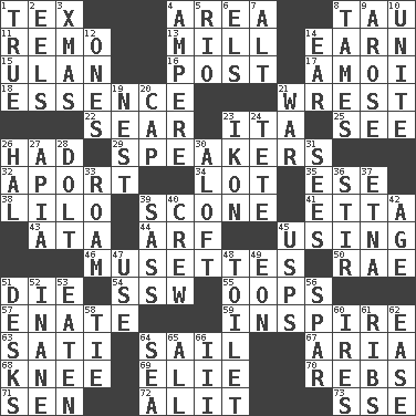 ACROSS 1. John Ritter's dad 4. Length times width 8. The 19th letter of the Greek alphabet 11. San ____ (Riviera town) 13. Place where flour is made 14. Merit 15. ____ Bator, Mongolia 16. Mail 17. Mine, in Marseilles 18. Substance 21. Obtain by seizing forcibly or violently 22. Wither 23. Call ___ day 25. Perceive with the eye 26. Possessed 29. Orators 32. To the left, to Queeg 34. Car dealer's back yard 35. Compass dir. 38. _ and Stitch 39. Biscuitlike quick bread 41. Singer James 43. _ moment's notice (2 wds.) 44. Sandy's bark 45. Putting into practice 46. French bagpipes 50. Actress Charlotte 51. Expire 54. Compass dir. 55. I made a mistake 57. Maternal 59. Stimulate to action 63. Suttee (variant) 64. Travel by water 67. Operatic vocal solo 68. Leg joint 69. Writer Wiesel 70. Confederate soldiers (slang) 71. Elected rep. 72. Came down and settled, as after flight 73. Compass dir. DOWN 1. Loyal 2. Snakelike fish 3. Dec. holiday 4. Electrical Unit 5. _ de Janeiro 6. Raised railways 7. The first octave above the treble staff 8. Makes less strong or intense 9. Came up 10. Join together 12. Washington bills 14. Hearing organ 19. Egg locale 20. Head covering 21. Armed conflict 23. Visual representation of an object 24. Wig 26. Actor Linden 27. Capital of Western Samoa 28. Dunce 30. Upward 31. Perceives with the eye 33. Wander aimlessly 36. Commotion 37. Inactive volcano in Sicily 39. Backtalk 40. Group working together 42. Grow older 45. United States Postal Service (abbr.) 47. Purpose 48. Bathroom 49. Period of immesurable duration 51. Writing tables 52. Silly 53. Ingested 56. Coast Guard woman 58. Neckwear 60. Angers 61. Chest bones 62. Relaxation 64. Ocean 65. 100% 66. One more than two