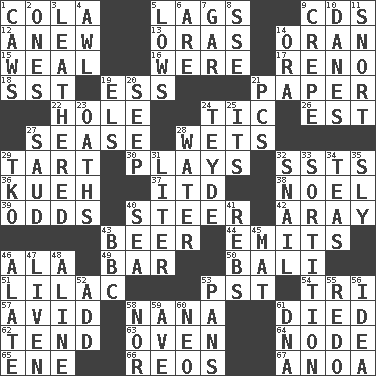 ACROSS 1. Root beer relative 5. Falls behind 9. Music discs 12. Afresh 13. Mouths or openings 14. NW Algerian seaport 15. Welt 16. We are 17. Former U.S. Attorney General Janet 18. Fast jet (abbr.) 19. Curvy letter 21. Some stationery 22. Opening into or through something 24. Nervous spasm 26. Eastern Standard Time (abbr.) 27. Gospel singer Marvin 28. Soaks 29. Small pie 30. Frolics 32. Fast planes 36. Malaysian steamed pastry 37. It would 38. Christmas carol 39. Probability 40. Navigate 42. Like ___ of sunshine 43. Fermented drink made from hops 44. Sends forth 46. In the manner of 49. Tavern 50. Indonesian resort city 51. Pale purple color 53. Pacific Standard Time (abbr.) 54. Three (prefix) 57. Enthusiastic 58. Grandmother 61. Passed on 62. Look after 63. Baking chamber 64. Connecting point 65. Compass dir. 66. Vintage cars 67. Small Philippine buffalo DOWN 1. Crow sounds 2. Washington bills 3. Tough but pliablecoriaceous 4. Leather borer 5. Moos 6. "We ___ not amused" (Victoria) 7. Slender fish 8. Compass dir. 9. Streamer paper 10. Natives or inhabitants of Denmark 11. Derisive sound 14. Mouth or opening 19. Raised railways 20. Ooze 21. Personal Computers (abbr.) 23. Expletives 24. Miss Universe 1986, Barbara Palacios _ 25. ___ a Wonderful Life 27. Saudi Arabian king (1953-1964) 28. Wetness 29. Ring climax 31. 61 cubic inches 32. Slow-paced one 33. Drawing lots 34. Beverages made from leaves 35. Roguish 40. Ocean 41. Confederate soldiers (slang) 43. English channel? 45. Floor protector 46. Having winglike extensions 47. Make or become more lively 48. Place in a line 52. Find the sum of 53. Zero-star reviews 55. Do over again 56. It may be bright or harebrained 58. And not 59. "___ Maria" 60. Modern: prefix 61. Heredity factor (abbr.)
