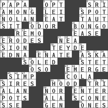 ACROSS 1. Dad 5. Elect 8. _ Lanka 11. Amid 13. Flowery wreath 14. Specific locale 15. Pitcher Ryan 16. Ingest 17. Pulled tight 18. Be seated 19. Scent 21. Beat drum 22. San ____ (Riviera town) 24. Relaxation 25. Eats (away) 27. Teachers' org. 29. The Jewish people; Israel 30. Miss Universe 1986, Barbara Palacios _ 32. Pulitzer Prize-winning author Ferber 33. Maternal 35. "____ silly question..." 39. Having a sole or soles 41. Proofreading order 42. Bear (Spanish) 43. Develop 45. Simple or foolish person 48. Root beer relative 49. Male parents of animals 50. Parka part 52. Three (prefix) 55. Actor Alda or Thicke 56. Not either 57. Keyboard key 59. Plant holders 60. Insect wing 61. Biscuitlike quick bread 62. Compass dir. 63. Commissioned military rank (abbr.) 64. Singles DOWN 1. Zero-star reviews 2. Mine, in Marseilles 3. Characterized by complete cowardliness 4. Santa ___, CA 5. Butter sub 6. Lightbulb-shaped fruit 7. Teat (slang) 8. Connects, as a bridge 9. Makeup applied to the cheeks 10. "Tell ____ the Marines!" 12. Dwarf 14. Portico 20. Two (Sp.) 21. Necklace unit 23. Ferber et al. 25. Compass dir. 26. To free from 27. Fish or hair follower 28. Sight organ 30. Bit 31. Artist's stand 33. Raised railways 34. Modern: prefix 36. Ski resort town in Vermont 37. Barrel 38. Had dinner 40. I made a mistake 43. Environmental prefix 44. Methods 45. Grain storage towers 46. Feeling or showing extreme anger 47. Not women's 49. Plant excrements 50. Hollow 51. Northwest Algerian city 53. French philosopher Descartes 54. Angers 56. Tired old horse 58. Non-commissioned officer (abbr.)
