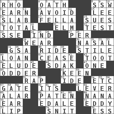 ACROSS 1. 17th letter of the Greek alphabet 4. Pledge 8. Compass dir. 11. Merit 13. Prevent from happening 15. Area sheltered from the wind 16. Thick slice 17. Man or boy (slang) 18. Institutes legal proceedings 19. "_____ Recall" 21. Shade tree 22. Trial 23. Compass dir. 24. Indiana (abbr.) 27. For each 29. Erode 30. Relating to the nose 34. Girls' org. (abbr.) 36. Travel on or in a vehicle 39. Vertical member of a panel or frame 40. Grant temporary use of 41. Stop 43. A blast of a horn 44. Dodge 46. Neighbor of Neb. 47. Single 48. More peculiar 49. Peachy ____! 51. Reproach for some lapse or misdeed 53. Binary compound 54. And so on (abbr.) 57. Yard entry 60. It is 63. Prying instrument 65. Having or resembling wings 66. Eucharist need 69. Nanny 70. Hearing organ 71. Peak District village in England 72. Whirlpool 73. Mouth edge 74. In a ____ (agitated or irritated) 75. Curvy letter DOWN 1. Musical pauses 2. Radiant circles of light 3. Declaim 4. Clumsy lout 5. "___ Maria" 6. Lacquered or enameled metalware 7. Land elevation 8. Change direction abruptly 9. Observes 10. 270 degrees 12. Basketball assoc. 14. Moist 18. Ski resort town in Vermont 20. Whopper 25. Drug cop 26. Frees from moisture 28. Followers of ems 29. Nomad 31. The Jewish people; Israel 32. Medicinal plant 33. Allow 34. Gilt 35. Saudi Arabian king (1953-1964) 37. June honoree 38. 1973 Nobel Price Winner (Physics) Leo 40. Lion 42. Supplemented with great effort 45. Epoch 50. Snakelike fish 52. Corncob 54. Elude 55. Is inclined (to) 56. Trading vessels 57. Highlander 58. Mountain range southwest of Kyrgyzstan 59. Canvas cover 61. Small boys 62. Comedian Laurel of Laurel & Hardy 64. Compass dir. 67. Connecticut Ivy Leaguer 68. Remaining after all deductions