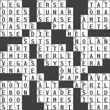 ACROSS 1. Part of a journey 4. Celtic language 8. Make lace 11. Lyric poems 13. Type of eclipse 15. Chief or king in Benin or Nigeria 16. Washington bills 17. Gospel singer Marvin 18. Among 19. Clothes sense 21. Parent Teacher Assoc. 22. Allows 23. Compass dir. 24. Pass on 27. Cartoonist voice _ Blanc 29. Fast planes 30. Pitcher Ryan 34. Nonscientific branch of learning 36. Singer James 39. Vertical member of a panel or frame 40. Independent ruler or chieftain 41. Haggard of country music 43. Not wild 44. Viva Las _ 46. System (abbr.) 47. Epoch 48. Maternal 49. At one time in the past 51. Label 53. Infant food 54. Actress Gardner 57. Printing process, for short 60. The first octave above the treble staff 63. Showery time 65. Inky black, to poets 66. Dodge 69. Disposed of to a purchaser 70. Sometimes accompanies a hiss 71. Citrus fruits 72. Capri or Wight 73. Put into a specified state 74. Is not 75. Ewer handle DOWN 1. Plunders 2. Ferber et al. 3. Honkers 4. Raised railways 5. Sorrow 6. Fastener 7. Compass direction 8. Heavy book 9. "This won't hurt ____!" 10. Bits 12. Fast jet (abbr.) 14. 480, 500 or 516 sheets of paper 18. One to whom something is allotted 20. Begley and Asner 25. Detail 26. _____ Park, CO 28. Followers of ems 29. Ski resort town in Vermont 31. One who doesn't tell the truth 32. _ mater 33. Born 34. So be it 35. Port city in Latvia 37. Attempt to accomplish something 38. Columnist Joseph or Stewart 40. Night before a holiday 42. Inactive volcano in Sicily 45. Ocean 50. Numbers guy (abbr.) 52. Highlander 54. Came up 55. Country estate 56. Tree or shrub in the Birch family 57. Confederate soldiers (slang) 58. Mitch Miller's instrument 59. A blast of a horn 61. 57 in ancient Rome 62. Scottish caps 64. Air pressure measure (abbr.) 67. Lair 68. Eastern Standard Time (abbr.)
