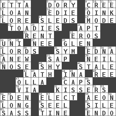 ACROSS 1. Singer James 5. Dinghy 9. Algonquian 13. Grant temporary use of 14. Singer Brickell 15. Pig sound 16. Old wives' tales, e.g. 17. Bobsleighs 18. Method 19. Sycophants 21. Fitting 22. Monthly bill 23. Greek god of love 24. Single; one (prefix) 27. Born 28. Small, secluded valley 29. Titled peers of a realm 31. Symbol (abbr.) 32. Pulitzer Prize-winning author Ferber 36. Afresh 37. Plant excrement 38. Famous astronaut Armstrong 39. Characteristic smell of wine 40. Like a shrinking violet 41. Having lost freshness 42. Thin strip of wood or metal 44. _ tizzy (2 wds.) 46. To separate or throw off 47. Spanish pot 48. Smile enhancers 50. By way of 51. Smoochers 54. Locale of original sin 56. Choose 58. Period of immesurable duration 60. Having great length 61. Stitch closed the eyes of (a falcon) 62. Drop; flow; fall 63. Backtalk 64. Prong on a fork 65. Inside; within (prefix) DOWN 1. Pipe bend 2. A blast of a horn 3. Edible starchy tuberous root 4. Approach 5. Keyboard key 6. Lyric poems 7. To free from 8. It is so 9. Piece 10. Disturbances 11. Conclusion 12. Supplement with great effort 17. Trig term 20. Hiding places for outlaws 21. "We ___ not amused" (Victoria) 23. Shade tree 24. ____ Bator, Mongolia 25. Words to Nanette 26. Angers 28. Hustle 30. Homes 31. Declare 33. Letter starter 34. Mediterranean tributary 35. Toward shelter 37. Quiet! 40. R.R. building 41. Plant excrements 43. Wing 44. Hanging ice 45. Political cartoonist Thomas 47. Baking chambers 49. Gospel singer Marvin 51. Peachy ____! 52. It's straight from the horse's mouth 53. Disposed of to a purchaser 54. Raised railways 55. ___ good deed 56. Eastern Standard Time (abbr.) 57. Flowery wreath 59. Modern: prefix