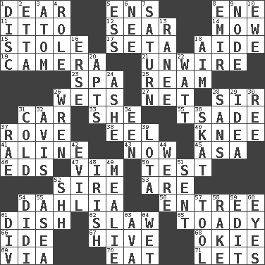 ACROSS 1. Letter starter 5. Followers of ems 8. Compass dir. 11. "Tell ____ the Marines!" 12. Singe 14. Cut the grass 15. Fur scarf 17. Bristle 18. Assistant 19. Device for capturing images 21. Undo the wiring of 23. Health resort 25. 480, 500 or 516 sheets of paper 26. Moistens 27. Remaining after all deductions 28. Title for a knight 31. Auto 33. A female animal or person 35. Sadhe (variant) 37. Be footloose 38. Snakelike fish 40. Leg joint 41. Place in a line 43. At this time 45. White ___ sheet 46. Begley and Asner 47. Zeal 50. Trial 52. Male parent of an animal 53. "We ___ not amused" (Victoria) 54. A pale violet or amethyst color 56. Main course 61. Food container 62. Cole _ (cabbage dish) 65. Sycophant 66. Binary compound 67. Hub of activity 68. Migrant worker of the '30s 69. By way of 70. Consume 71. Allows DOWN 1. Flat circle 2. Singer James 3. Smallest unit of an element 4. Hero or heavy, e.g. 5. Double-curved letter 6. Born 7. Titan orbits this 8. Independent ruler or chieftain 9. Connecting point 10. She-sheep 13. Indian princess (variant) 16. Celtic language 18. Direct toward a target or goal 20. Flats, for short 22. Electrical Unit 24. American tennis player Robert 26. Songbird 28. Without 29. The main thing one is thinking about 30. To separate or throw off 31. Lacking warmth 32. Advice 34. Car or cant ending 36. Three-handed card game 37. Actress Charlotte 39. Globular water bottle used in Asia 42. Morally bad or wrong 44. Past tense of be (plural) 48. From or relating to Ireland 49. Ear of corn 51. Posted 52. Quiet! 54. "You Light Up My Life" star Conn 55. Toward the sea 57. Utensil 58. Immoral or dissolute person 59. Prepare for publication 60. Sight organs 61. HTML Container Element 63. Actress Gardner 64. Soggy
