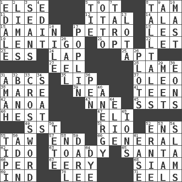 ACROSS 1. Otherwise 5. Small child 8. Scottish cap 11. Passed on 12. Slanted text style (abbr.) 14. Chicken ___ king 15. At full speed 17. Stone: prefix 18. French article 19. Small, flat, pigmented spot on the skin 21. Elect 22. Allow 23. Double-curved letter 24. Pet locale 25. Fitting 27. Snakelike fish 28. Unable to walk 31. Lettered men learn these first 35. Mouth edge 37. Butter sub 38. Female horse 39. Teachers' org. 41. Adolescent 42. Small Philippine buffalo 43. Compass dir. 45. Fast planes 46. Behest 47. Connecticut Ivy Leaguer 49. Fast jet (abbr.) 51. _ de Janeiro 52. Followers of ems 55. The 23rd letter of the Hebrew alphabet 57. Conclusion 60. Commissioned military rank 62. Wedding promise 63. Sycophant 65. Before Barbara or Clara 66. For each 67. Suggestive of the supernatural 68. Thailand, formerly 69. Working for oneself (abbr.) 70. Area sheltered from the wind 71. Snakelike fish DOWN 1. Peak District village in England 2. Citrus fruits 3. Actors Connery and Penn 4. Prepare for publication 5. Standoff 6. Von Bismarck 7. Canvas cover 8. Baron Munchausen's specialties 9. Toward shelter 10. Vertical spar for supporting sails 13. Globular water bottle used in Asia 16. The longest river in the world 17. Cotton for raincoats, e.g. 20. Highlander 26. Small pieces of grounds 29. Confront 30. Immeasurably long periods of time 31. Wet nurse 32. Object of repulsion 33. What you're doing now 34. Theater features 36. Animal enclosure 40. Disorder of the immune system 44. Writer Wiesel 48. Charged atoms 50. Wig 52. Bert's buddy 53. Brizilian seaport 54. Criticizes harshly 55. Native american tent (variation) 56. An important port of Yemen 58. Christmas carol 59. Have the gumption 61. Comfort 64. Color