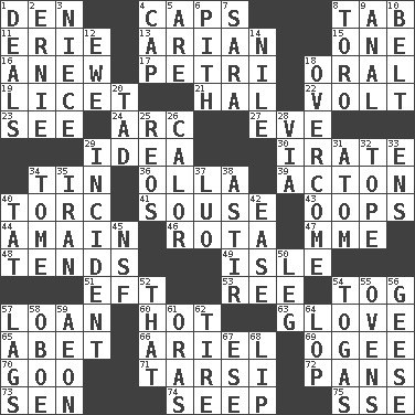 ACROSS 1. Lair 4. Balmoral and tarboosh 8. Bar bill 11. 4th largest of the Great Lakes 13. Believer in; advocate of (suffix) 15. Single 16. Afresh 17. _ dish (used to culture cells) 18. Relating to the mouth 19. It is permitted: Lat. 21. Actor Linden 22. Electrical Unit 23. Observe 24. Curve 27. Night before a holiday 29. The content of cognition 30. Feeling or showing extreme anger 34. Metal container 36. Spanish pot 39. Gambison 40. Torque (variant) 41. Lush 43. I made a mistake 44. At full speed 46. Roll call or roster of names 47. Madame (abbr.) 48. Is inclined (to) 49. Small island 51. Bank Draft (abbr.) 53. To separate or throw off 54. Coat; cloak 57. Grant temporary use of 60. Being at a high temperature 63. Michael Jackson trademark 65. Collude with 66. Satellite of Uranus 69. Double curve, resembling the letter S 70. Thick or sticky substance 71. Tarsus (plural) 72. Zero-star reviews 73. Elected rep. 74. Ooze 75. Compass dir. DOWN 1. Allots cards 2. Bert's buddy 3. Sibling's daughter 4. Head covering 5. "We ___ not amused" (Victoria) 6. Heart or essence 7. "Two Mules for Sister ____" 8. "Corrida" creature 9. Of or related to the anus 10. Waist strap 12. She-sheep 14. The longest river in the world 18. Conquer 20. Small amount or degree 25. Vintage cars 26. Bodily heat indicating an inflammation 28. By way of 29. Event 31. Tiny particle 32. Drink excessively 33. Followers of ems 34. Heavy book 35. SW Asia republic 37. Nilotic language 38. Moving about 40. Make lace 42. Comfort 45. Overdraft (abbr.) 50. Part of a journey 52. Not this but _ 54. Ancient Roman robes 55. Baking chambers 56. Honkers 57. Fails to keep up a pace 58. Mitch Miller's instrument 59. Period of immesurable duration 61. Mouths or openings 62. Become fatigued 64. Trim (branches) 67. Compass dir. 68. Mouth edge