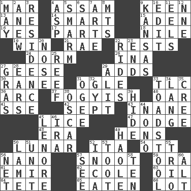 ACROSS 1. Make imperfect 4. Indian state 9. Peachy ____! 13. A saturated hydrocarbon 14. Don Adams' spy role 15. An important port of Yemen 16. Consenting reply 17. Actors' quests 18. The longest river in the world 19. Victory 21. Actress Charlotte 22. Musical pauses 24. Dormintory (informal) 26. _ tizzy (2 wds.) 27. Honkers 29. Does sums 30. Indian princess (variant) 31. Stare 33. Affectionate concern, for short 36. Curve 37. Out of fashion; old fashioned 40. Rowing implement 41. Compass dir. 42. Back-to-school mo. 43. Lacking in sense or substance 45. Louse (plural) 47. Evade 48. Period 49. Coop moms 50. Type of eclipse 52. Call ___ day 54. Baseball player Mel 56. Billionth: prefix 57. Snob 59. Mouth or opening 61. Arab leader 62. Learning spot: Fr. 63. Petroleum 64. False hair 65. Eroded 66. Car dealer's back yard DOWN 1. Can I? 2. Afresh 3. Dwelling 4. Cleo's killer 5. Excessive but superficial compliments 6. "Two Mules for Sister ____" 7. Johnson of "Laugh-In" 8. Mountains (abbr.) 9. Sunflower state 10. Prepare for publication 11. Snakelike fish 12. Compass dir. 20. Olfactory organ 22. Amusement-park features 23. Conclude 25. Coral ridge 27. Pate de foie ____ 28. Hearing organs 29. Came down and settled, as after flight 31. Double curve, resembling the letter S 32. Swindle 33. Inedible or poisonous agaric 34. Long (Scottish) 35. Algonquian 38. Motion picture award 39. Flintstone garb 44. Words to Nanette 45. Poe poem 46. Lyricist Gershwin 49. White Person, in Hawaii 50. Unable to walk 51. A single undivided whole 52. South American Indian 53. A blast of a horn 55. Musical group of three 56. Remaining after all deductions 57. Observe 58. "___ Little Indians" 60. The first octave above the treble staff