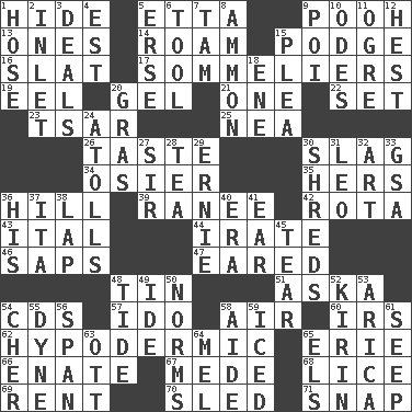 ACROSS 1. Flintstone garb 5. Singer James 9. "Silly old bear" 13. Washington bills 14. Wander 15. Plash 16. Narrow board 17. Wine waiters 19. Snakelike fish 20. Set 21. Single 22. Arrange properly for use 23. Russian ruler of old 25. Teachers' org. 26. Clothes sense 30. Volcanic refuse 34. Flexible twig of a willow tree 35. Possessive pronoun 36. Land elevation 39. Indian princess (variant) 42. Round or rotation of duties 43. Slanted text style (abbr.) 44. Feeling or showing extreme anger 46. Plant excrements 47. Having ears or earlike features 48. Shallow baking pan 51. "____ silly question..." 54. Music discs 57. Wedding promise 58. Atmosphere 60. Big collection agency 62. Below the epidermis 65. 4th largest of the Great Lakes 66. Related on the mother's side 67. Ancient Persian 68. Louse (plural) 69. Monthly bill 70. Downhill vehicle 71. Fastener DOWN 1. Flexible conduit 2. An arm off of a larger body of water 3. Allots cards 4. Eastern Standard Time (abbr.) 5. Celtic language 6. Implement 7. Scottish cap 8. ID or VA city 9. Luau course 10. Lyric poems 11. Legendary monster 12. Behest 15. Entreaty 18. Compass dir. 20. Pate de foie ____ 24. Ringlike coral islands and reefs 27. Title for a knight 28. Beverage made from leaves 29. Bert's buddy 30. Fragments 31. Lion 32. Tate display 33. Girls' org. (abbr.) 36. Part of HMS, perhaps 37. Call ___ day 38. Infant locale 40. Epoch 41. Hearing organ 45. Separate forcefully 48. Event that recurs at intervals 49. Binary compound 50. Typical models 52. Japanese brewing company 53. N. Chile seaport 54. "Mermaids" star 55. Unit of force 56. Connect, as a bridge 58. Helper 59. On the rocks 61. Ooze 63. Baseball player Mel 64. Cartoonist voice _ Blanc 65. Raised railways