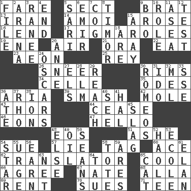 ACROSS 1. Conductor's collection 5. Religious group 9. Naughty child 13. SW Asia republic 14. Mine, in Marseilles 15. Came up 16. Grant temporary use of 17. Frustrating wastes of time 19. Compass dir. 20. Wind 21. Mouth or opening 22. Ingest 23. A really long time 25. Marina Del _, California 26. Scornful expression 30. Basketball hoops 34. Cell (Danish) 35. Lyric poems 36. Roberta Peters solo 39. Box-office sellout 42. Undercover agent 43. Son of Odin 44. Stop 46. Immeasurably long periods of time 47. Phone greeting 48. Greek goddess of the dawn 51. American tennis player Robert 54. Institute legal proceedings 57. Untruth 58. Label 60. Adept person 62. Interpreter 65. Calm and collected 66. Match 67. Nathan's nickname 68. Silent film actress Nazimova 69. Monthly bill 70. Institutes legal proceedings 71. Adolescent DOWN 1. Do some clerical work 2. Sports stadium 3. Indian princess (variant) 4. Conclusion 5. Indian skirt 6. Independent ruler or chieftain 7. Gear tooth 8. The easternmost of the Lesser Sundas 9. Sis' sibling 10. Hero or heavy, e.g. 11. Toward the sea 12. Trial 15. Like ___ of sunshine 18. "We ___ not amused" (Victoria) 20. Singer Murray 24. Motion picture awards 27. Raised railways 28. Shade tree 29. Arrive at 30. Lover boys 31. Wedding promise 32. Cartoonist voice _ Blanc 33. Compass dir. 36. Had dinner 37. 17th letter of the Greek alphabet 38. Electrically charged atom 40. Perceive with the eye 41. Actor Linden 45. Volcanic refuse 48. Otherwise 49. Lubricate 50. Actors Connery and Penn 52. White Person, in Hawaii 53. Learning spot: Fr. 54. Play the lead 55. Goad 56. Merit 58. Haul 59. Ancient Greek god of war 61. Style 63. Remaining after all deductions 64. The 19th letter of the Greek alphabet 65. Feline