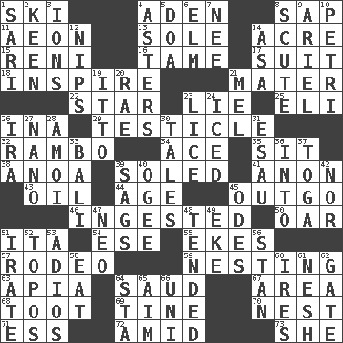 ACROSS 1. What Jean-Claude Killy likes to do 4. An important port of Yemen 8. Plant excrement 11. A really long time 13. Flatfish 14. 1/640 square mile 15. Painter Guido (1575-1642) 16. Not wild 17. Costume for a special activity 18. Motivate 21. Mother 22. Play the lead 23. Falsehood 25. Connecticut Ivy Leaguer 26. _ tizzy (2 wds.) 29. A testis 32. Role for Stallone 34. Adept person 35. Be seated 38. Small Philippine buffalo 39. Having a sole or soles 41. Soon (poet.) 43. Petroleum 44. Ripen 45. Outlay 46. Consumed 50. Boat paddle 51. Call ___ day 54. Compass dir. 55. Makes supply last 57. Cowboy competition 59. Inhabiting a nest 63. Capital of Western Samoa 64. Saudi Arabian king (1953-1964) 67. Length times width 68. A blast of a horn 69. Prong on a fork 70. A home for chicks 71. Double-curved letter 72. Among 73. A female animal or person DOWN 1. Indian skirt 2. Peachy ____! 3. Charged atoms 4. Michaelmas daisies 5. ___ good deed 6. Shade tree 7. Born 8. Turtle shell scale 9. Satellite of Uranus 10. _ dish (used to culture cells) 12. Cuts off 14. White ___ sheet 19. "Tell ____ the Marines!" 20. Actress Charlotte 21. Cartoonist voice _ Blanc 23. Louse (plural) 24. On the rocks 26. Retirement account (abbr.) 27. Billionth: prefix 28. Mine, in Marseilles 30. Stories 31. Son of Isaac 33. Indonesian resort city 36. To the inside or interior of 37. Ancient Roman robe 39. Sinks 40. Double curve, resembling the letter S 42. And not 45. Lyric poems 47. Modern: prefix 48. Watched over 49. Supplement with great effort 51. Feeling or showing extreme anger 52. Traditional theme or motif 53. Goodbye (Sp.) 56. Comedian Laurel of Laurel & Hardy 58. Erode 60. Angers 61. Delicate 62. Yard entry 64. R.R. building 65. Direct toward a target or goal 66. Single; one (prefix)