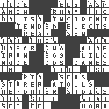 ACROSS 1. Periodic rise and fall of the sea level 5. Raised railways 8. Cleo's killer 11. At once, immediately (arch.) 12. Wander aimlessly 13. Lion 14. Greek mezzo-soprano Agnes 17. Event 19. Looked after 21. Opts 22. Stern 23. Elected rep. 24. Make lace 27. Greek god of love 29. "One Day ___ Time" 32. Ethiopian city, capital of Harari 34. Heredity factor (abbr.) 36. Having or resembling wings 37. SW Asia republic 38. Greek goddess of the dawn 39. _ and Stitch 40. Thickened enlargement 41. Two (Sp.) 42. Natives or inhabitants of Denmark 43. Compass dir. 44. Become fatigued 46. Compass dir. 47. Parent Teacher Association (abbr.) 50. Oceans 52. A viewer who gazes fixedly 55. Ringlike coral islands and reefs 57. Newsperson 59. Unemotional ones 62. It is 63. Drop; flow; fall 64. Narrow board 65. Perceive with the eye 66. Snakelike fish 67. Israeli folk dance DOWN 1. Bar bill 2. _ tizzy (2 wds.) 3. Dunce 4. Keyboard key 5. Period of immesurable duration 6. Shoestrings 7. Grin 8. Actor Baldwin 9. Emitted 10. Cooking vessels 12. To free from 15. Contemptuous expression 16. The sixth month of the Jewish calendar 18. Lair 20. Worn away 24. One or ones belonging to thee 25. Composer Copland 26. Buy and sell 28. Snout, nose 29. Place in a line 30. Falsehoods 31. Came up 33. One (Scot) 35. Aid 36. Chicken ___ king 42. Started a card game 45. Vintage cars 47. Adept person 48. Laconic 49. Nick name for Arthur 51. Make a splashing sound 52. Indian titles of respect 53. Wig 54. Domed church section 55. "We ___ not amused" (Victoria) 56. Grain storage tower 58. Pipe bend 60. Auto 61. R.R. building