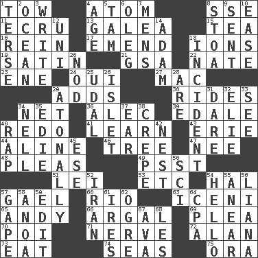 ACROSS 1. Pull behind 4. Tiny particle 8. Compass dir. 11. Shade of tan 13. An organ shaped like a helmet 15. Afternoon social gathering 16. It's straight from the horse's mouth 17. Make improvements or corrections to 18. Charged atoms 19. Smooth fabric 21. Girls' org. (abbr.) 22. Nathan's nickname 23. Compass dir. 24. Fr. "Yes" 27. Big _ 29. Does sums 30. Amusement-park features 34. Fish or hair follower 36. Actor Baldwin 39. Peak District village in England 40. Redecorate 41. Memorize 43. One of the Great Lakes 44. Place in a line 46. Family _ (genealogy) 47. Born 48. Entreaties 49. Inconspicuous attention getter 51. Flowery wreath 53. And so on (abbr.) 54. Actor Linden 57. Highlander 60. _ de Janeiro 63. Ancient Celtic tribe of eastern Britain 65. Actor Griffith 66. Therefore, facetiously 69. Entreaty 70. Luau course 71. Boldness 72. Actor Alda or Thicke 73. Erode 74. Oceans 75. Mouth or opening DOWN 1. Laconic 2. Sea 3. Compose 4. Ripen 5. Scottish cap 6. Cassini of fashion 7. Not women's 8. Portico 9. Transmitted 10. Comfort 12. Single; one (prefix) 14. First man 18. Happening 20. Lower and raise head in agreement 25. Freehold land 26. Small island 28. "We ___ not amused" (Victoria) 29. Without tonality 31. Have the gumption 32. Writer Wiesel 33. Observe 34. 1994 drama film starring Jodie Foster 35. Singer Brickell 37. Hearing organ 38. Streamer paper 40. Reproach for some lapse or misdeed 42. A home for chicks 45. Compass dir. 50. _-fi 52. SW Asia republic 54. Phone greeting 55. Approach 56. Woody, climbing, usually tropical plant 57. Yawn 58. Small Philippine buffalo 59. Prepare for publication 61. Angers 62. Legendary monster 64. Accounting whiz (abbr.) 67. Actress Gardner 68. French article