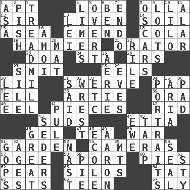 ACROSS 1. Fitting 4. Ear part 8. Spanish pot 12. Title for a knight 13. Make or become more lively 14. Land 15. Toward the sea 17. Make improvements or corrections to 18. Root beer relative 19. More overdramatic by comparison 21. Speaker 23. ___ good deed 24. R.R. building 26. Big collection agency 27. Stricken, poetically 28. Snakelike fish 30. Cards in a Roman deck? 31. Turn aside suddenly 34. Infant food 37. Pipe bend 38. Nick name for Arthur 39. Mouth or opening 40. Snakelike fish 41. Parts 42. To free from 43. Soap bubbles 44. Singer James 46. Set 47. Afternoon social gathering 50. Armed conflict 51. Place where plants grow 54. Devices for capturing images 57. Double curve, resembling the letter S 58. To the left, to Queeg 60. Sliced desserts 62. Lightbulb-shaped fruit 63. Grain storage towers 64. Make lace 65. Fast planes 66. Adolescent 67. Cunning DOWN 1. White ___ sheet 2. Expression of disdain 3. Excercise machine 4. Citrus fruits 5. Unconcealed 6. Benjamin's nick name 7. Inside; within (prefix) 8. Motion picture awards 9. Plunders 10. _ and Stitch 11. Having or resembling wings 13. Flowery wreath 16. Mine, in Marseilles 20. Floor covering 22. Cause heat under the collar 25. Nest on high 27. Filth; sediment 29. Nights before holidays 30. Area sheltered from the wind 31. Alleged 32. Take or capture by force 33. And so on (abbr.) 34. Likenesses of persons 35. Roberta Peters solo 36. Groovy apt. 41. Whimper 43. Spring feasts 44. She-sheep 45. Canvas cover 46. Relatively large 48. Learning spot: Fr. 49. Composer Copland 51. Republicans 52. Matures 53. Political cartoonist Thomas 55. Mountains (abbr.) 56. Lick closed 59. Sliced dessert 61. Filthy place