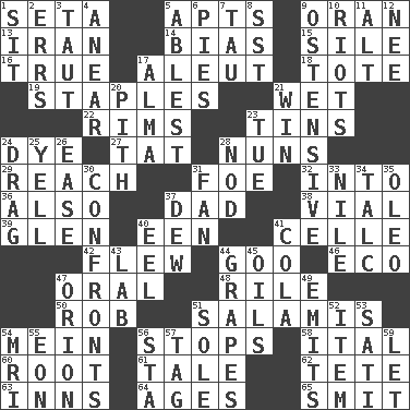 ACROSS 1. Bristle 5. Tenement units (abbr.) 9. NW Algerian seaport 13. SW Asia republic 14. Prejudice 15. Drop; flow; fall 16. Loyal 17. Native American of Southwest Alaska 18. Carry 19. Paper fasteners 21. Dripping 22. Basketball hoops 23. Metal containers 24. Color 27. Make lace 28. Religious women 29. Arrive at 31. Enemy 32. To the inside or interior of 36. In addition 37. Male parent 38. Small bottle 39. Small, secluded valley 40. Car or cant ending 41. Cell (Danish) 42. Soared 44. Thick or sticky substance 46. Environmental prefix 47. Spoken 48. Cause heat under the collar 50. Director Reiner 51. Deli grouping 54. Count _ (2 wds.) 56. Halts 58. Slanted text style (abbr.) 60. Carrot, for example 61. Lie 62. False hair 63. Restaurants 64. Eras 65. Stricken, poetically DOWN 1. Be seated 2. Blunders 3. Pulled tight 4. Approach 5. Most capable 6. Sliced desserts 7. The 19th letter of the Greek alphabet 8. Fast jet (abbr.) 9. Clearly or manifestly demonstrative 10. Disturbances 11. The first octave above the treble staff 12. Born 17. _ mater 20. Heart or essence 21. Acquire through effort 23. Third day of the wk. 24. To be drawn or hauled along 25. Shout 26. Comfort 28. Dreamland 30. Meets 31. Air blower 33. "Death on the ____" 34. Baby powder 35. Butter sub 37. Morning condensation 40. Snakelike fish 41. Root beer relative 43. Experiment locale 44. Wine fruits 45. Petroleums 47. Constellation of myth 49. Sends forth 51. Not divided or shared with others 52. A whole individual unit 53. Suttee (variant) 54. Medical imaging device (abbr.) 55. A really long time 56. R.R. building 57. Label 59. Allow